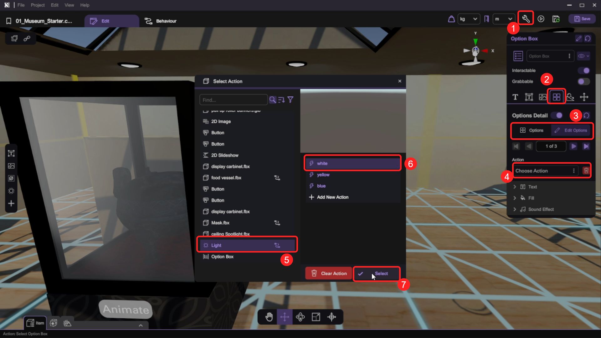 Select the option box object and open its "Inspector". For the first option "White", select the light object's "white" action for its "Action" under "Option Detail". Switch to the "Yellow" and "Blue" options and repeat the procedure to set up their corresponding actions.