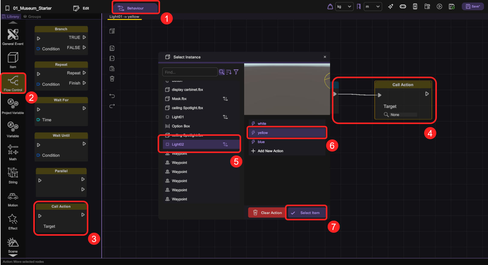 Go back to select the light object on the left-side, open its behaviour panel and select the "yellow" action you've configured earlier. Switch to behaviour library, drag and drop the "Call Action" block under the "Flow Control" category to the canvas, and append it behind the "Set Color" block. Select the duplicated light object's "yellow" action under "Call Action" block's "Target Action".