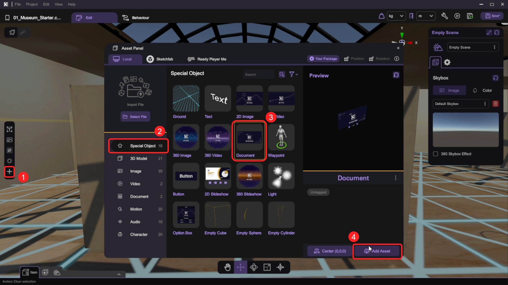 - Open the "Asset Panel" and from the "Special Objects" tab, select and add a "Document" to the scene.