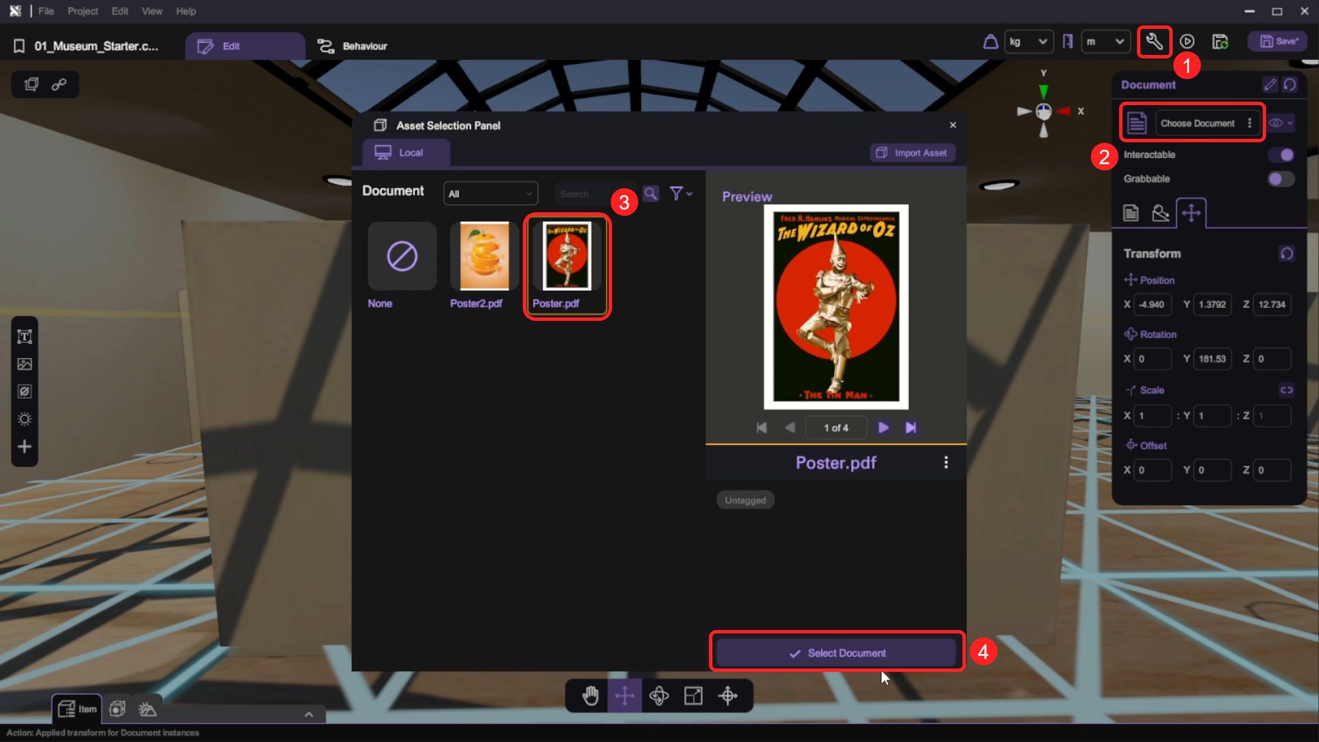 - Open the "Inspector", click the selector next to the "Document Asset" option to open the Selection panel and select a pdf document in your asset library to show the document in scene.