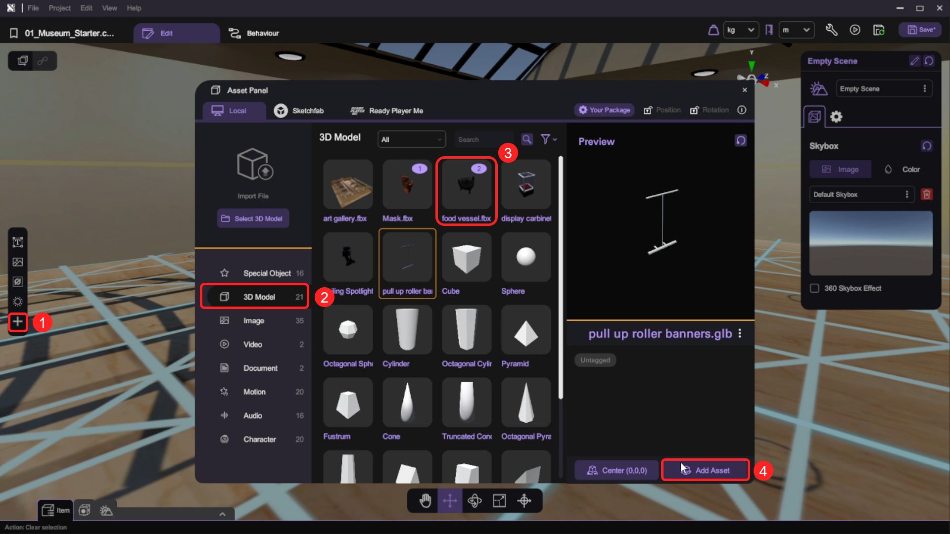 - Open the "Asset Panel" and from the "3D Model" tab, select and add the "pull up banners.glb" 3D model to the scene.