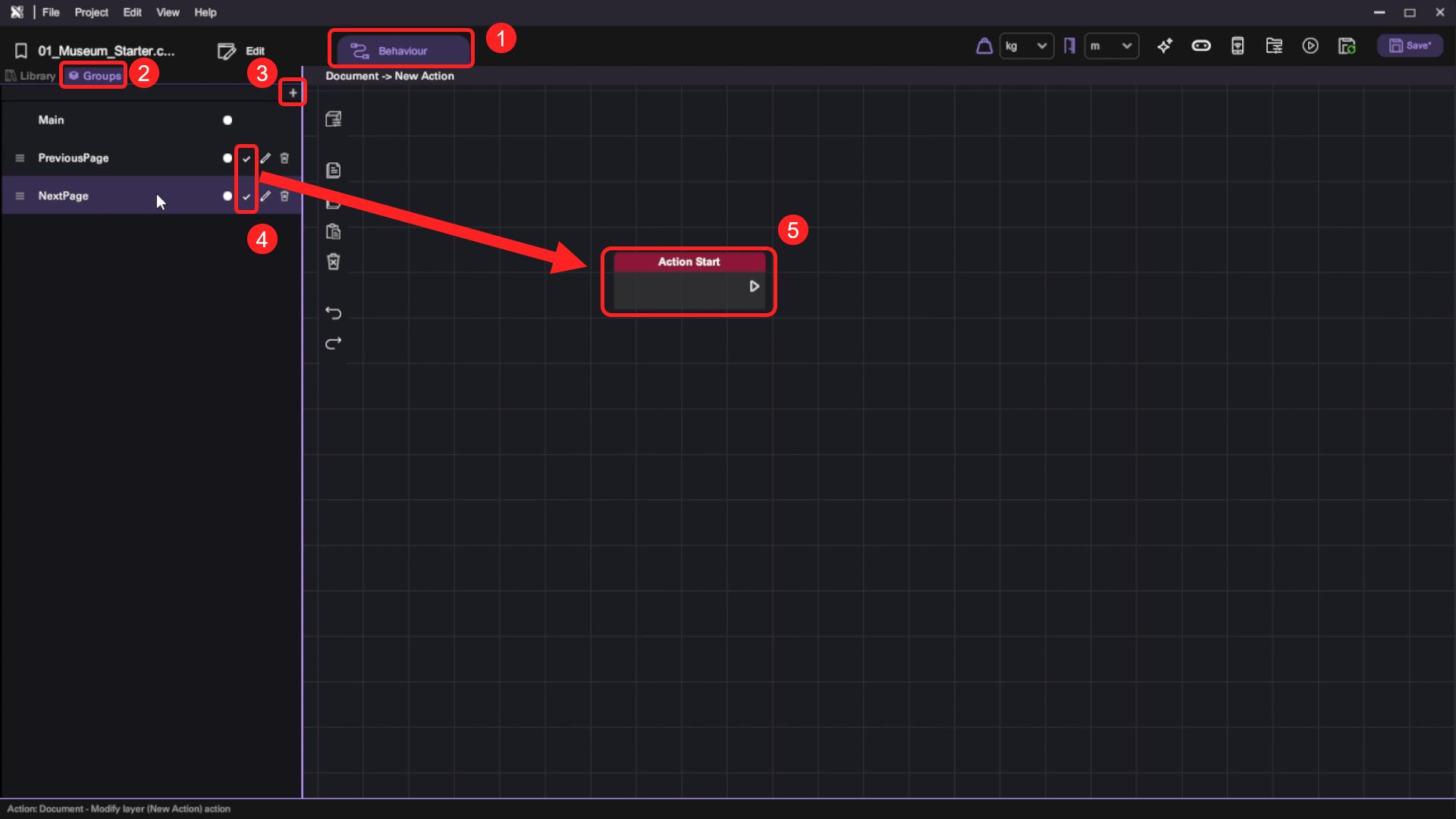 - Select the document object and open its behaviour panel. Under "Groups", add two new behaviour group named "PreviousPage" and "NextPage", and toggle the "Action" button to make it an action that can be called by other objects. An "Action Start" event trigger block will appear on the canvas.