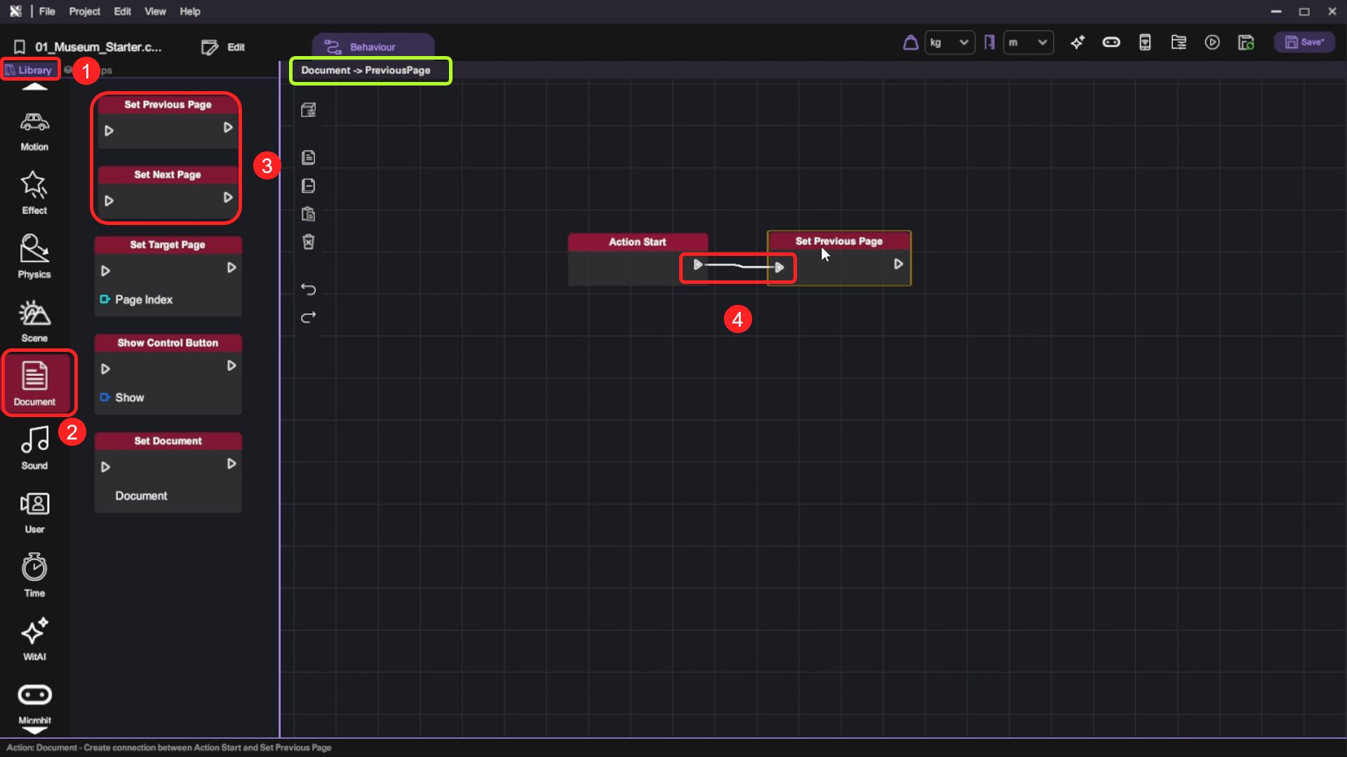 - Switch to behaviour Library, under the "Document" category drag the "Set Previous Page" block and append it behind the "Action Start" block. Then connect the "Action Start" block and the "Set Previous Page" block. When this action is called, the document display will be set to the previous page.