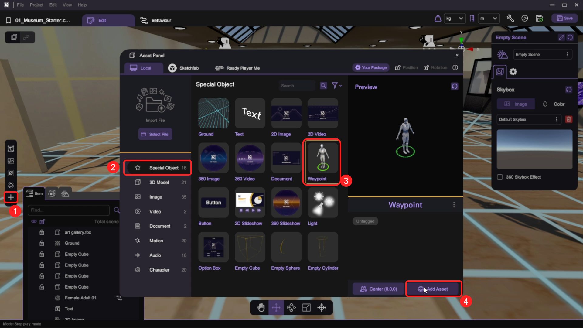 - Open the "Asset Panel" and from the "Special Objects" tab, select and add a "Point of Interest" to the scene.