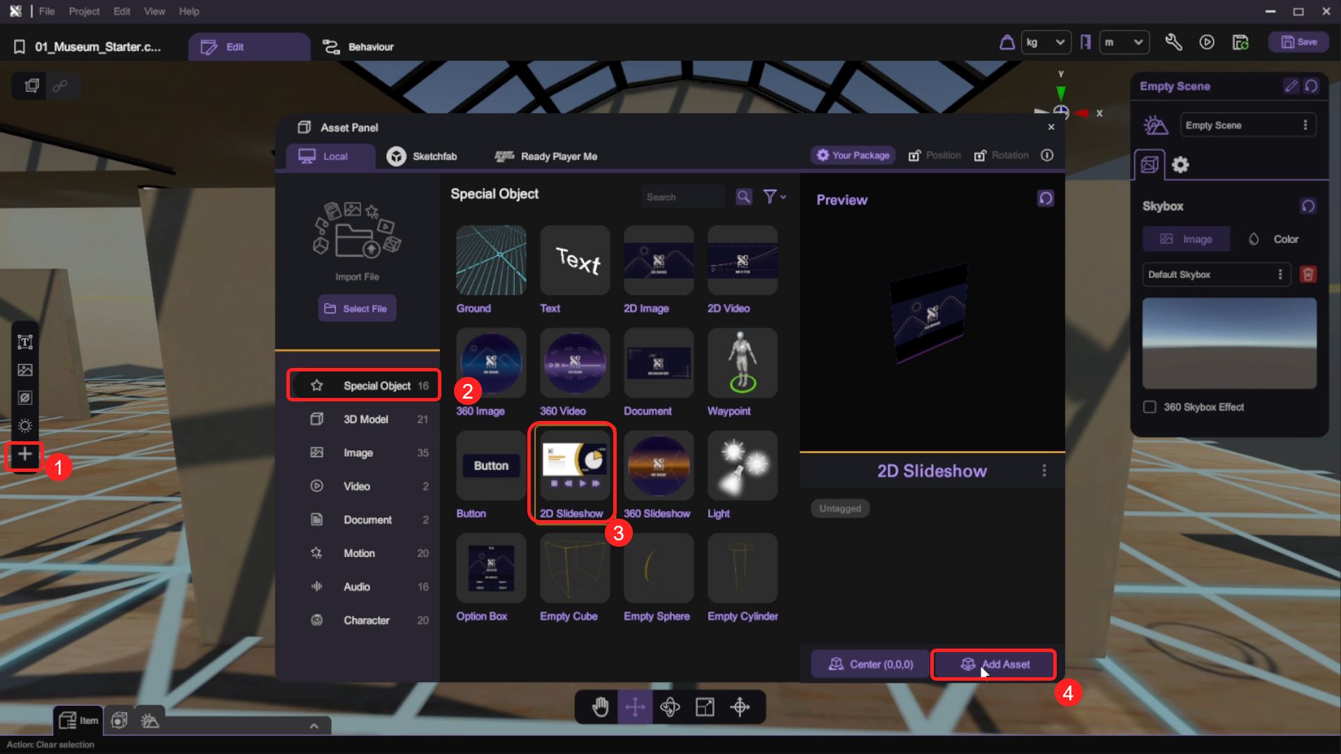 - Open the "Asset Panel" and from the "Special Objects" tab, select and add a "2D Slideshow" to the scene.