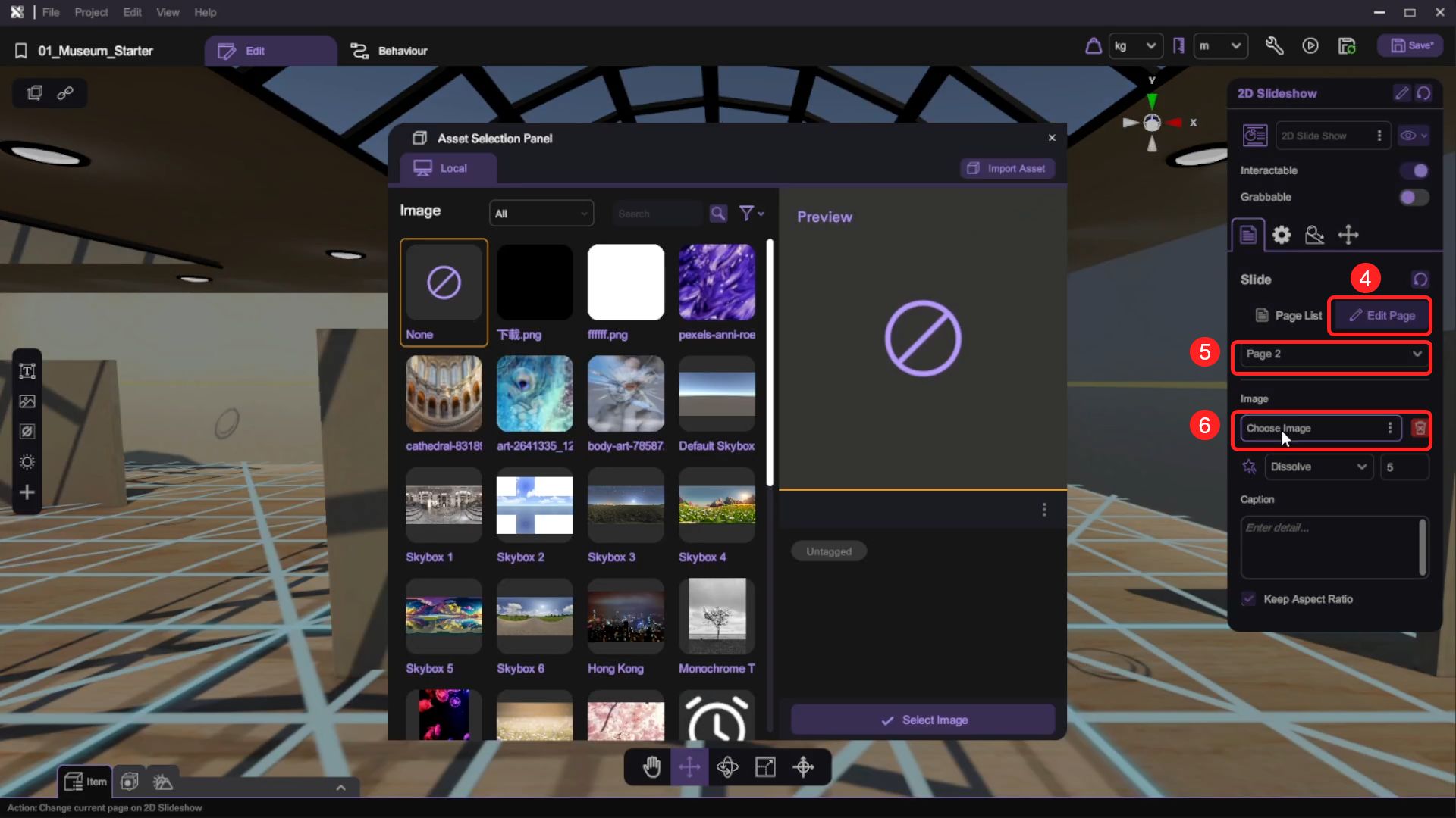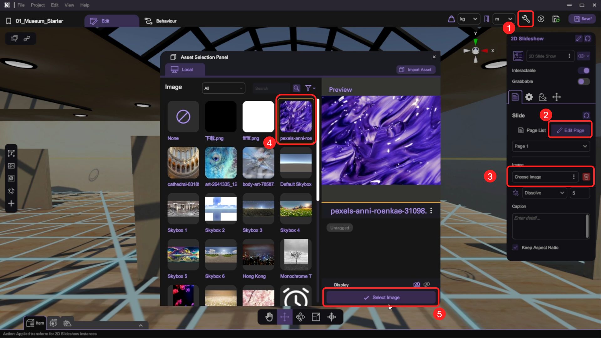 - Open the "Inspector" and set up the first slide of the 2D slideshow object by clicking the selector next to the "Slide Image" option, select an image from your asset library to add the image to slideshow.