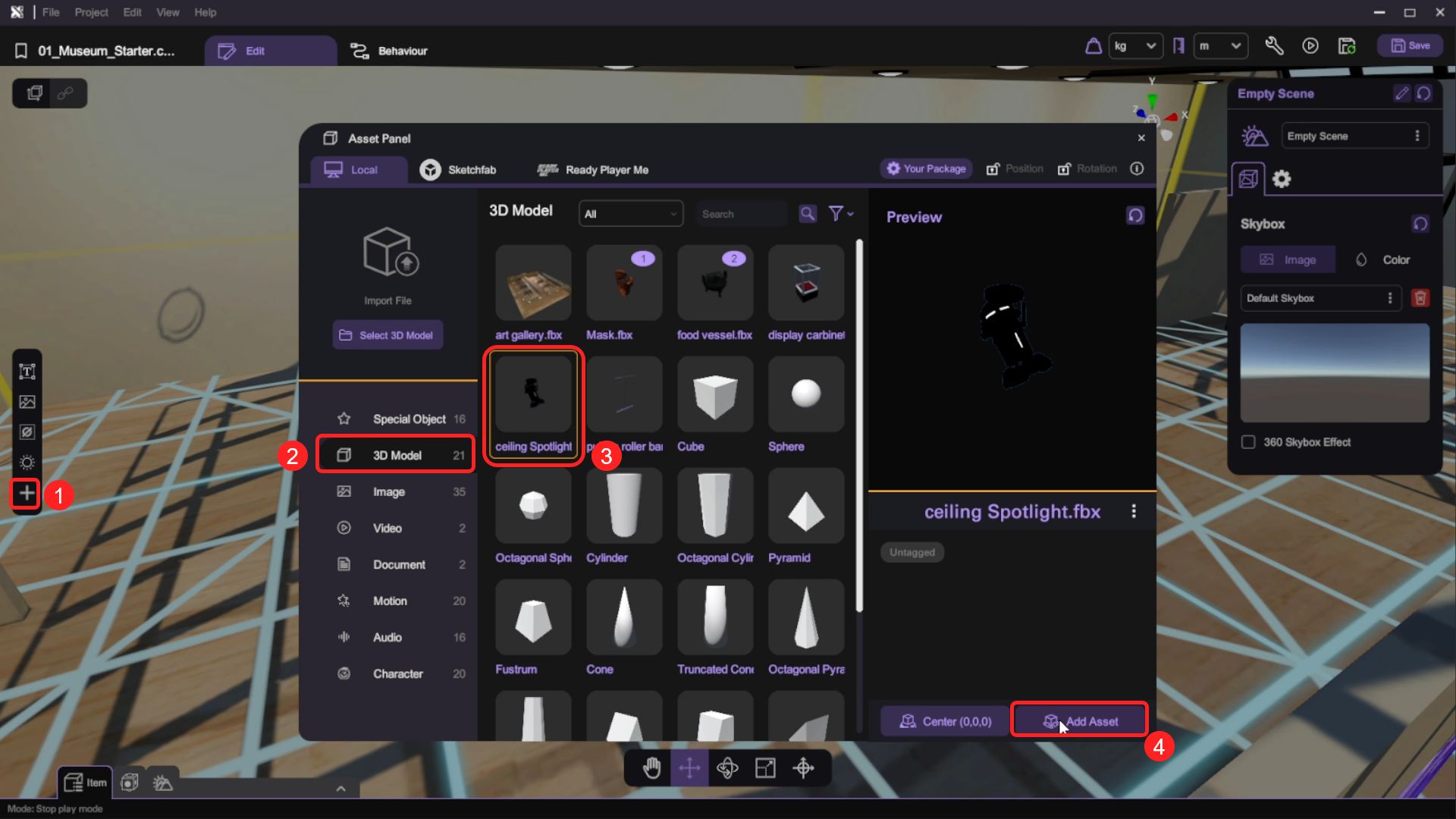 - Open the "Asset Panel" and from the "3D Model" tab, select and add the "ceiling Spotlight.fbx" 3D model to the scene.