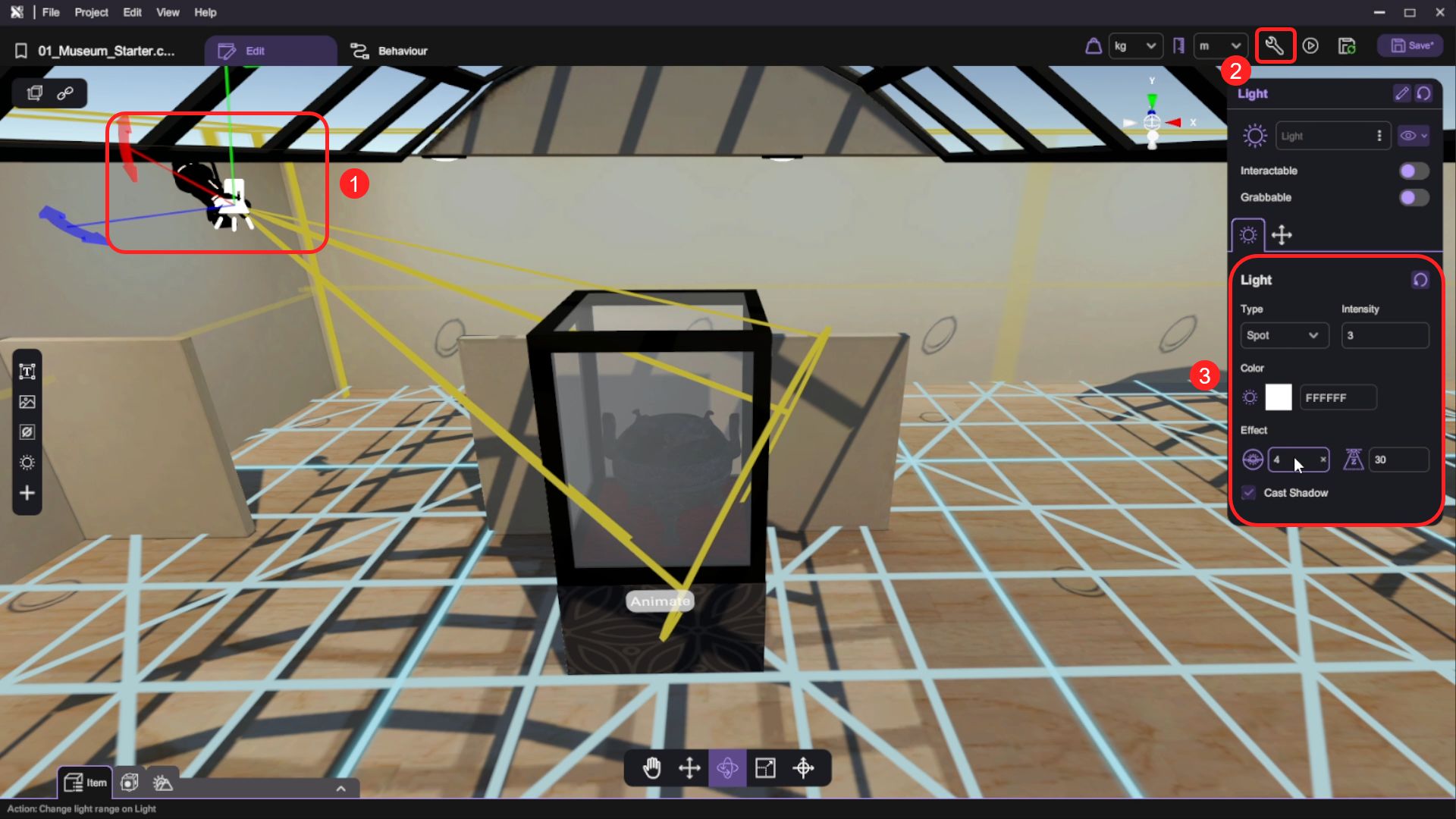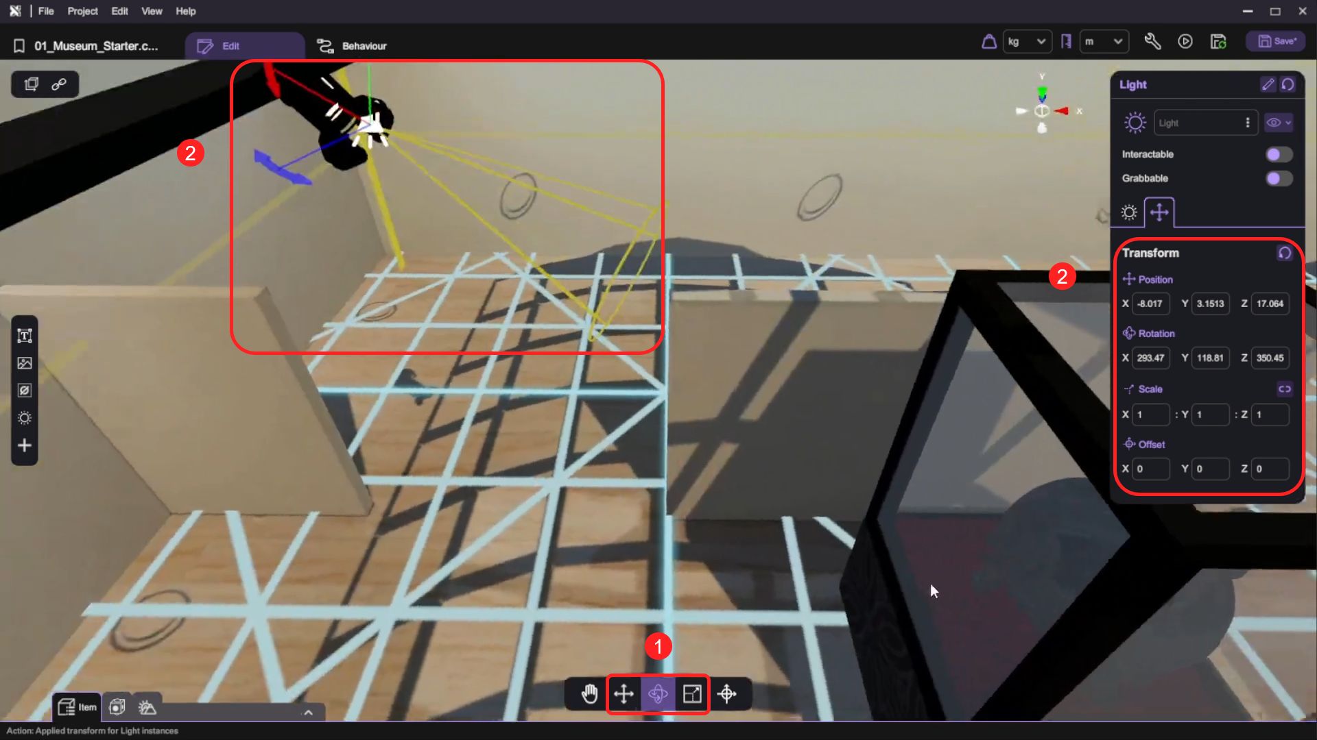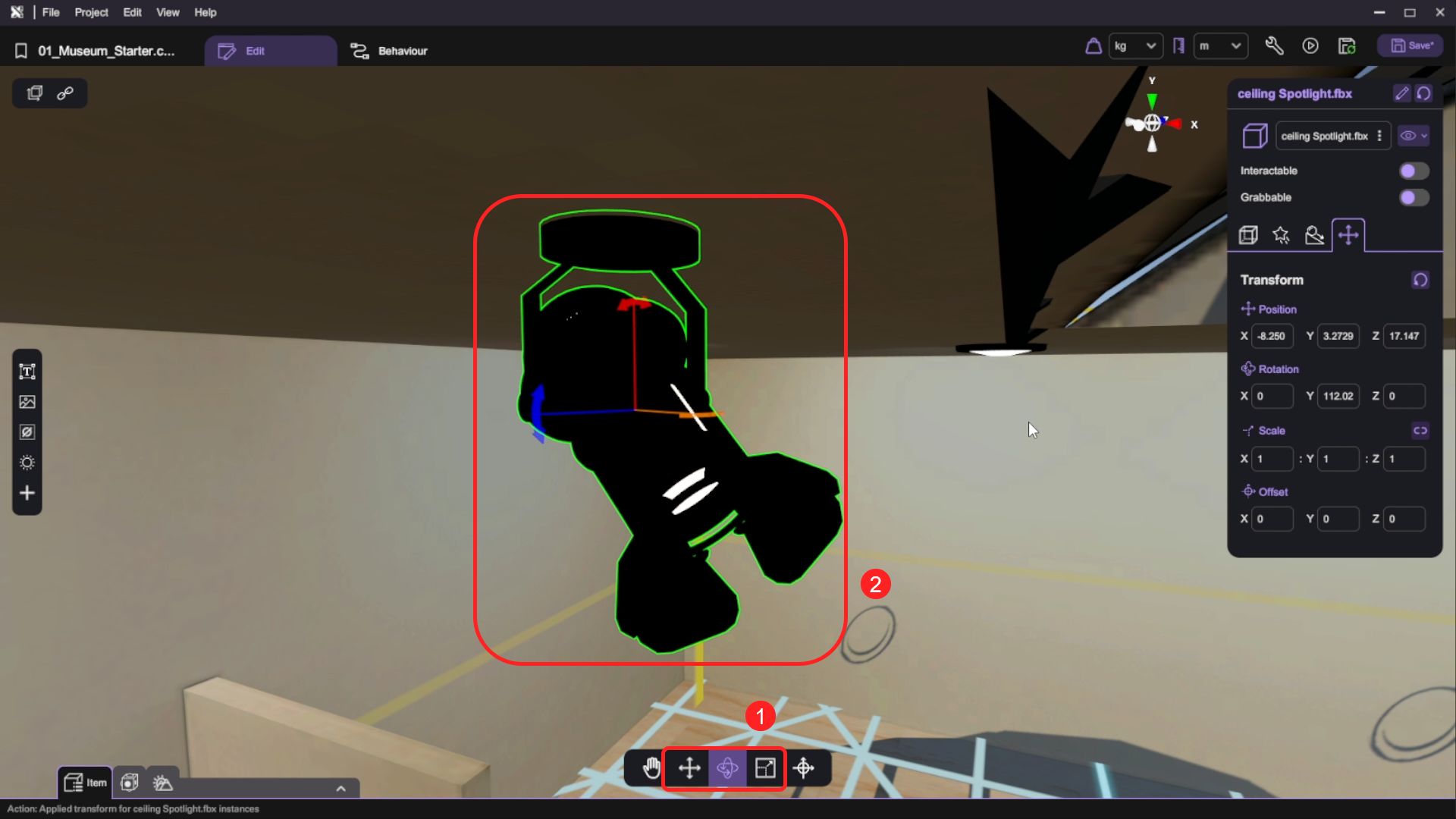 - Use the transform tools (move/rotate/scale) to place the spotlight object at the ceiling facing the display cabinet.