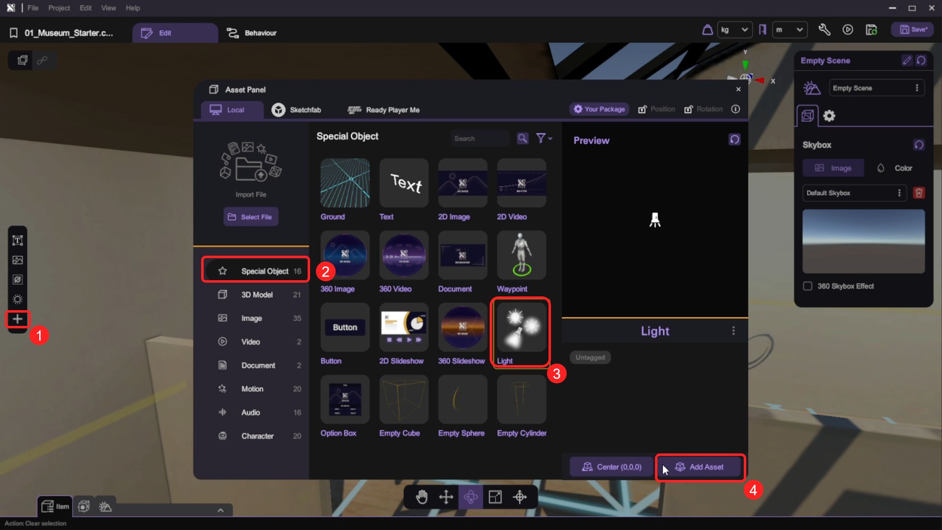 - Open the "Asset Panel" and from the "Special Objects" tab, select and add a "Light" to the scene.