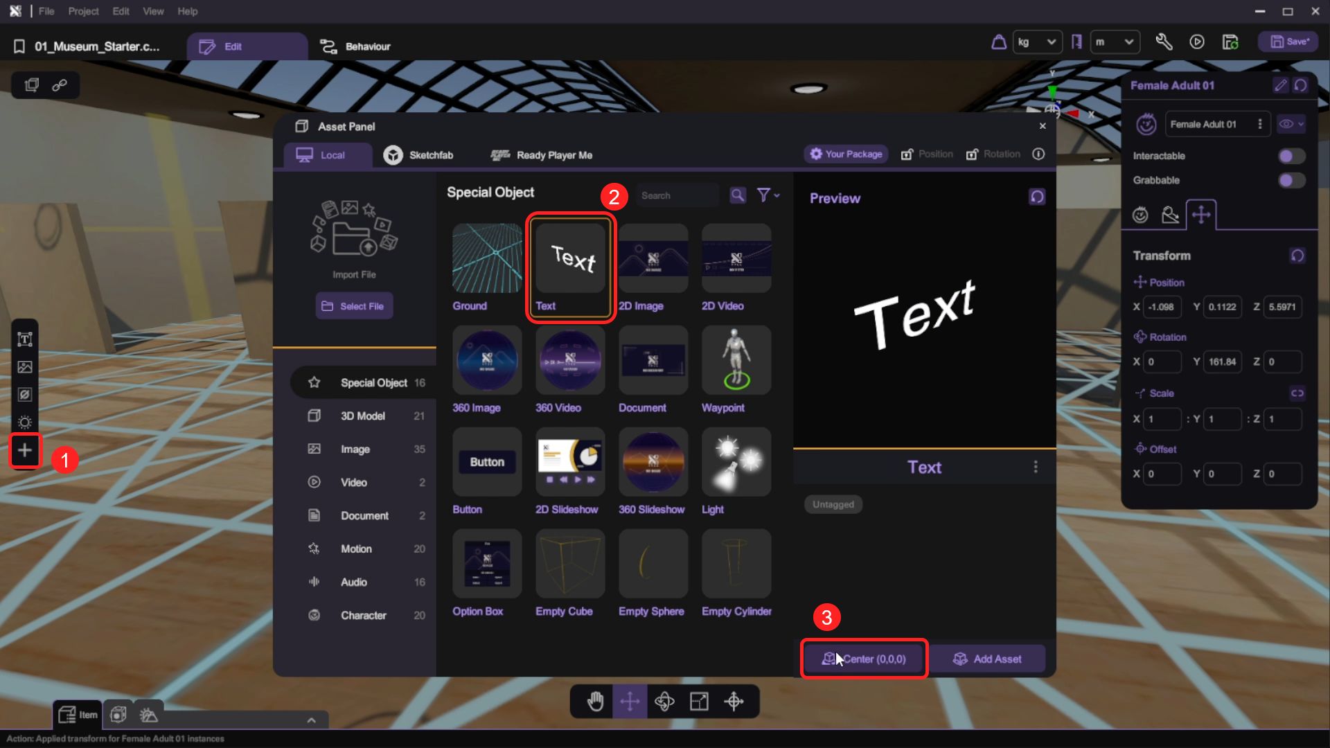- Open the "Asset Panel" and from the "Special Objects" tab, select and add a "Text Object" to the scene.