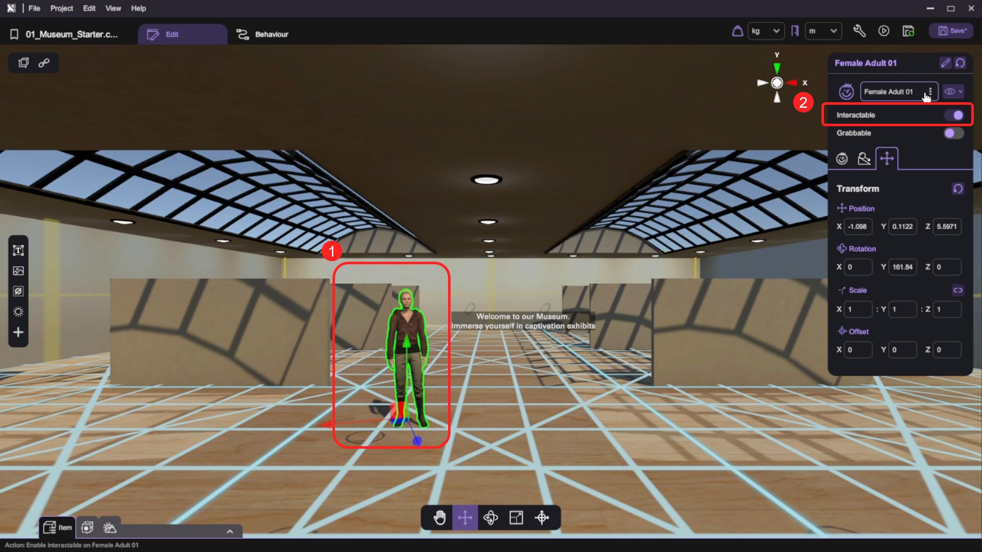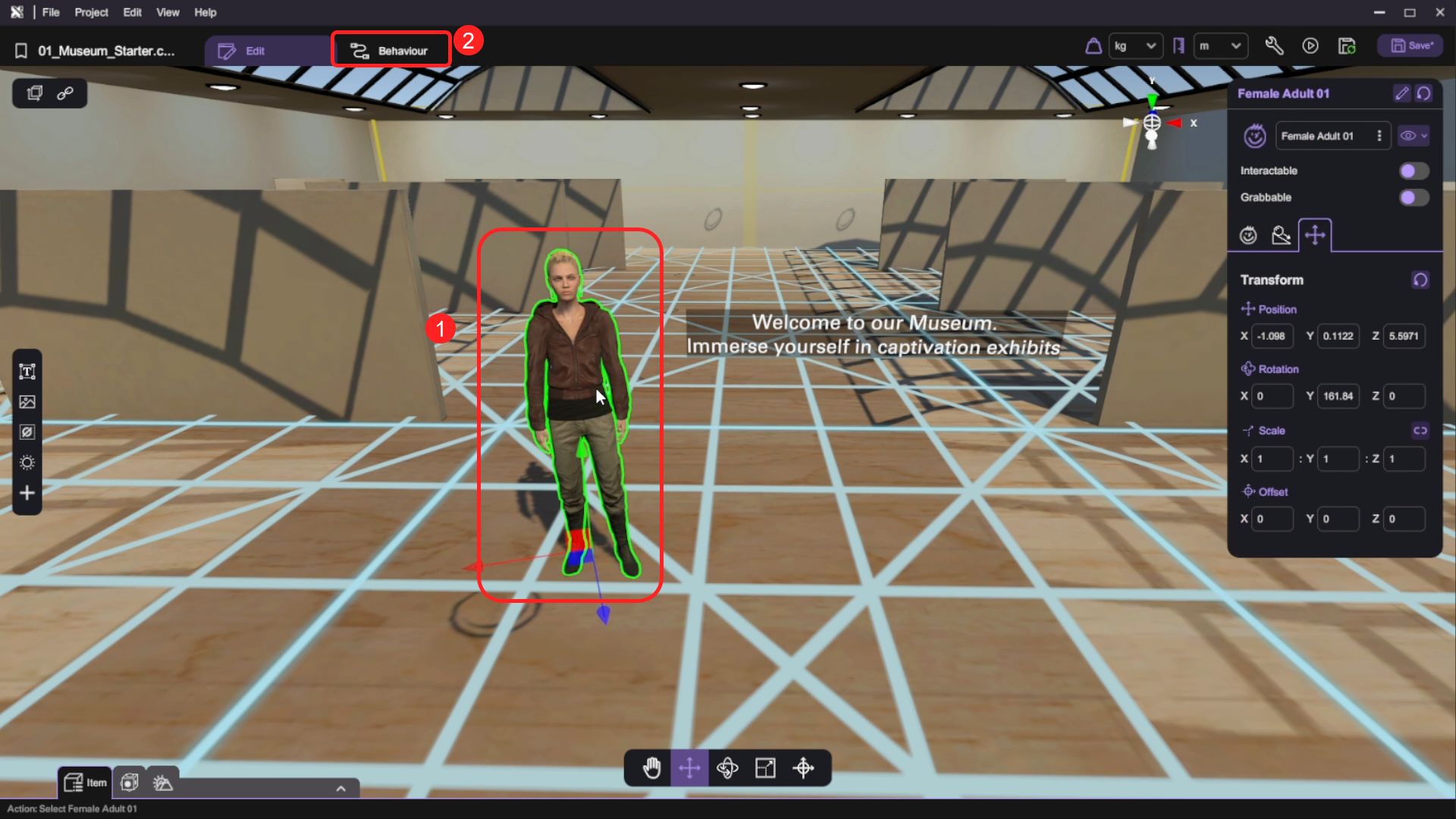 In this section, we will add a character to act as a guide in the VR museum. This includes selecting and positioning the character model, and setting up interactions so the character can speak and move when the scene starts or when the user clicks on it. This will improve the immersive experience for users.
