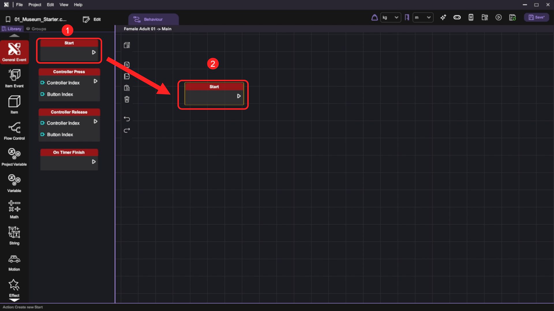 - In the "General" category, find and drag the "Start" event trigger block onto the behaviour canvas.