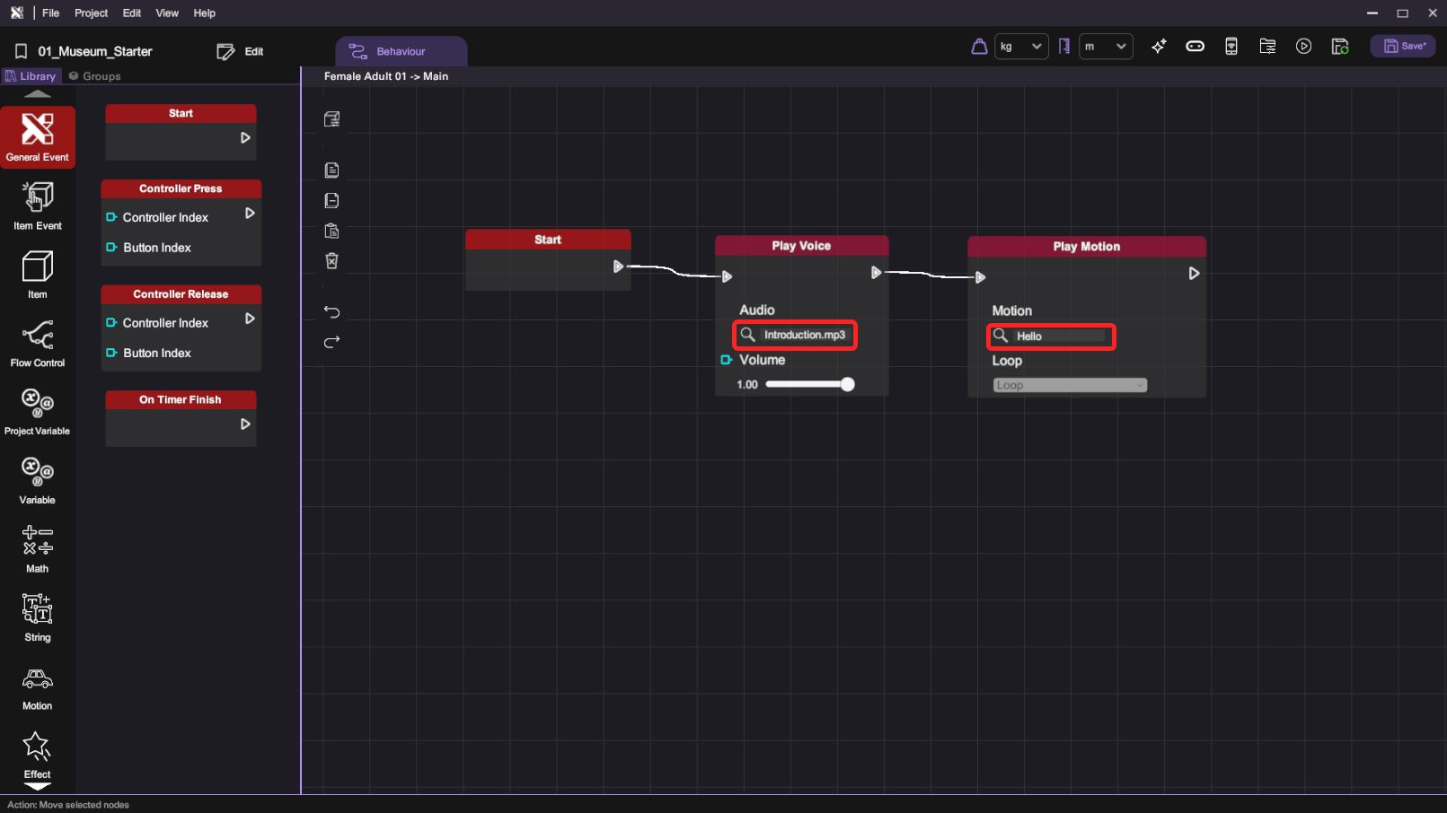 - Then switch to the "Character" category, find and drag both the "Play Voice" and "Play Motion" behaviour blocks onto the behaviour canvas. Connect the "Start" block's out flow node with the "Play Voice" block's in flow node, and "Play Voice" block's out flow node with "Play Motion" block's in flow node.