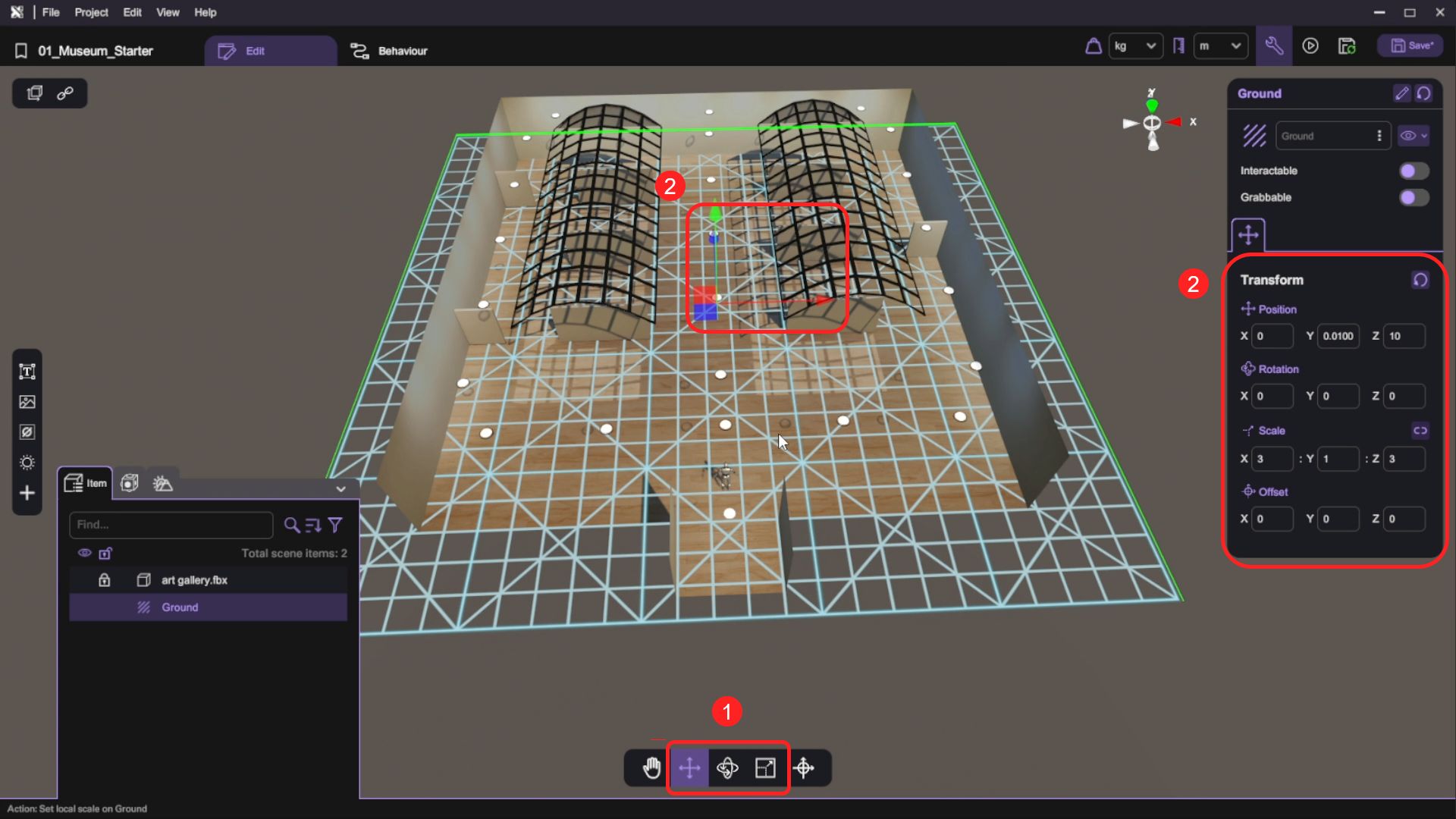 - Use the transform tools (move/rotate/scale) to adjust the size and position of the ground object