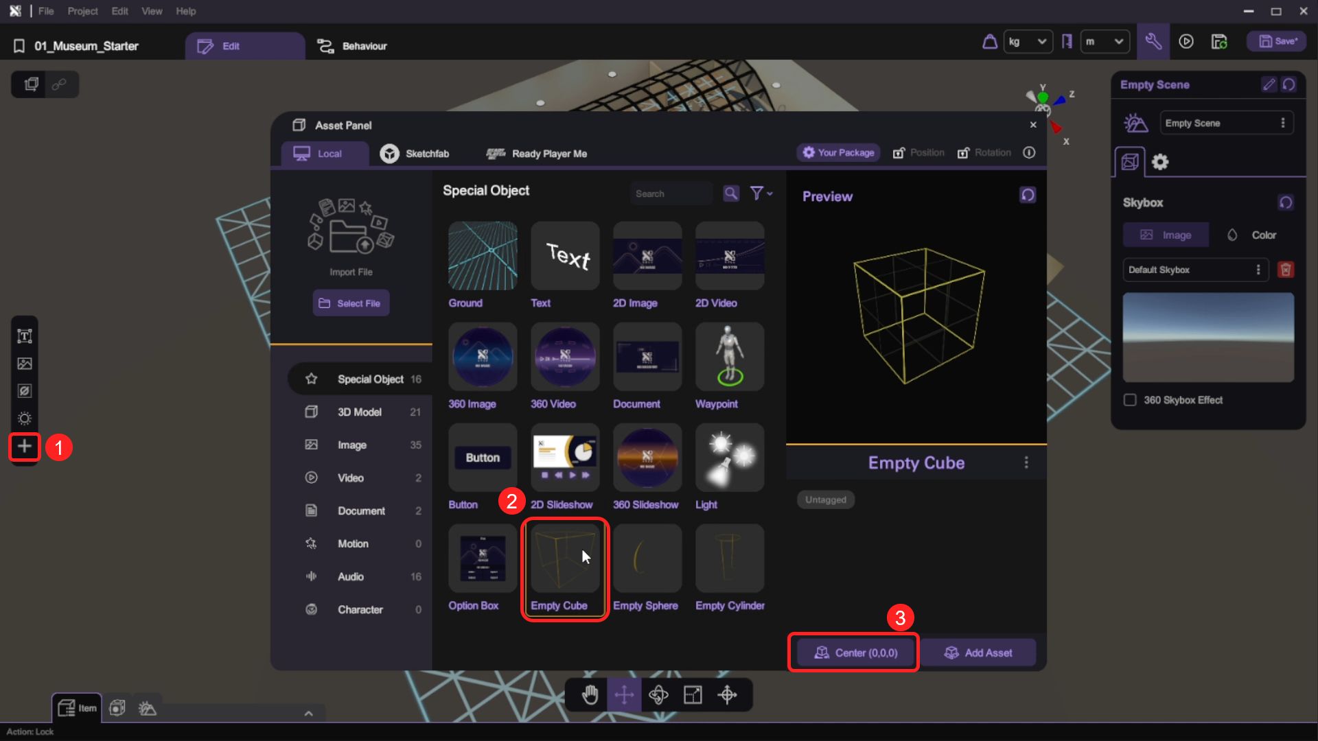 - Open the "Asset Panel" and from the "Special Objects" tab, select and add an "Empty Cube" to the scene.