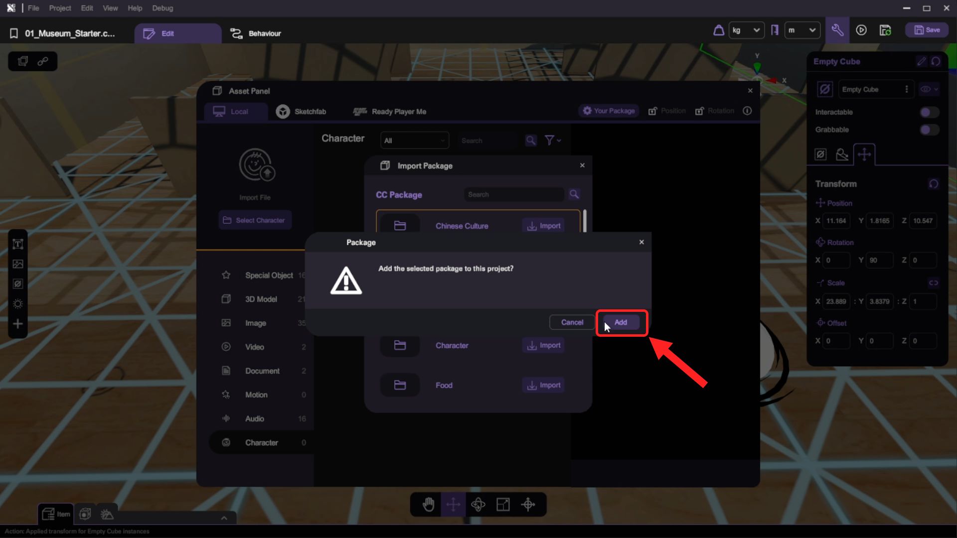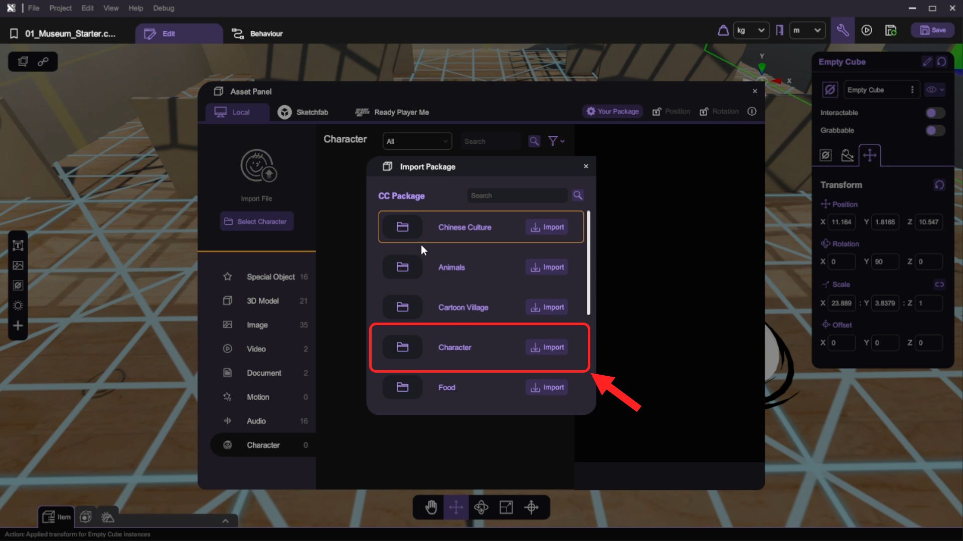 - Check the "Character" model in the Asset Panel, if there is null, click "Your Package".