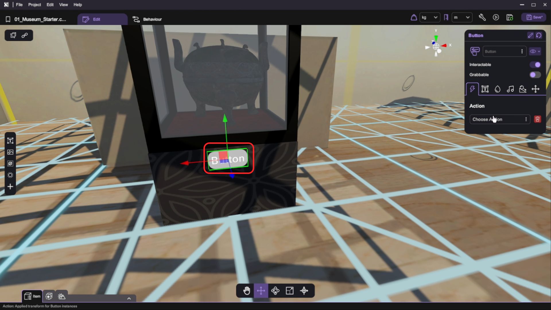 - Open the "Asset Panel" and from the "Special Objects" tab, select and add a "Button" to the scene. Use the transform tools to position the button object on the wall next to the document object.