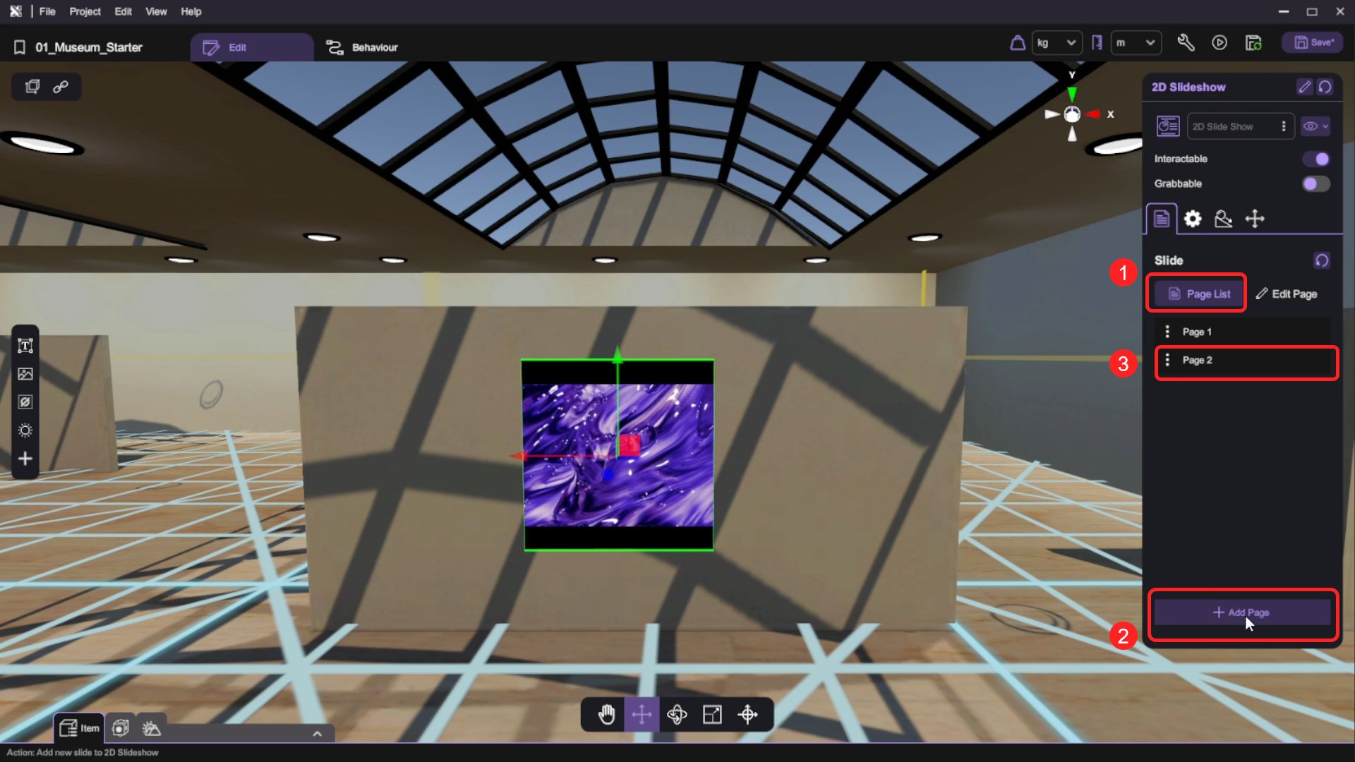 - Use the transform tools (move/rotate/scale) to place the 2D slideshow object on the left wall of the art gallery.