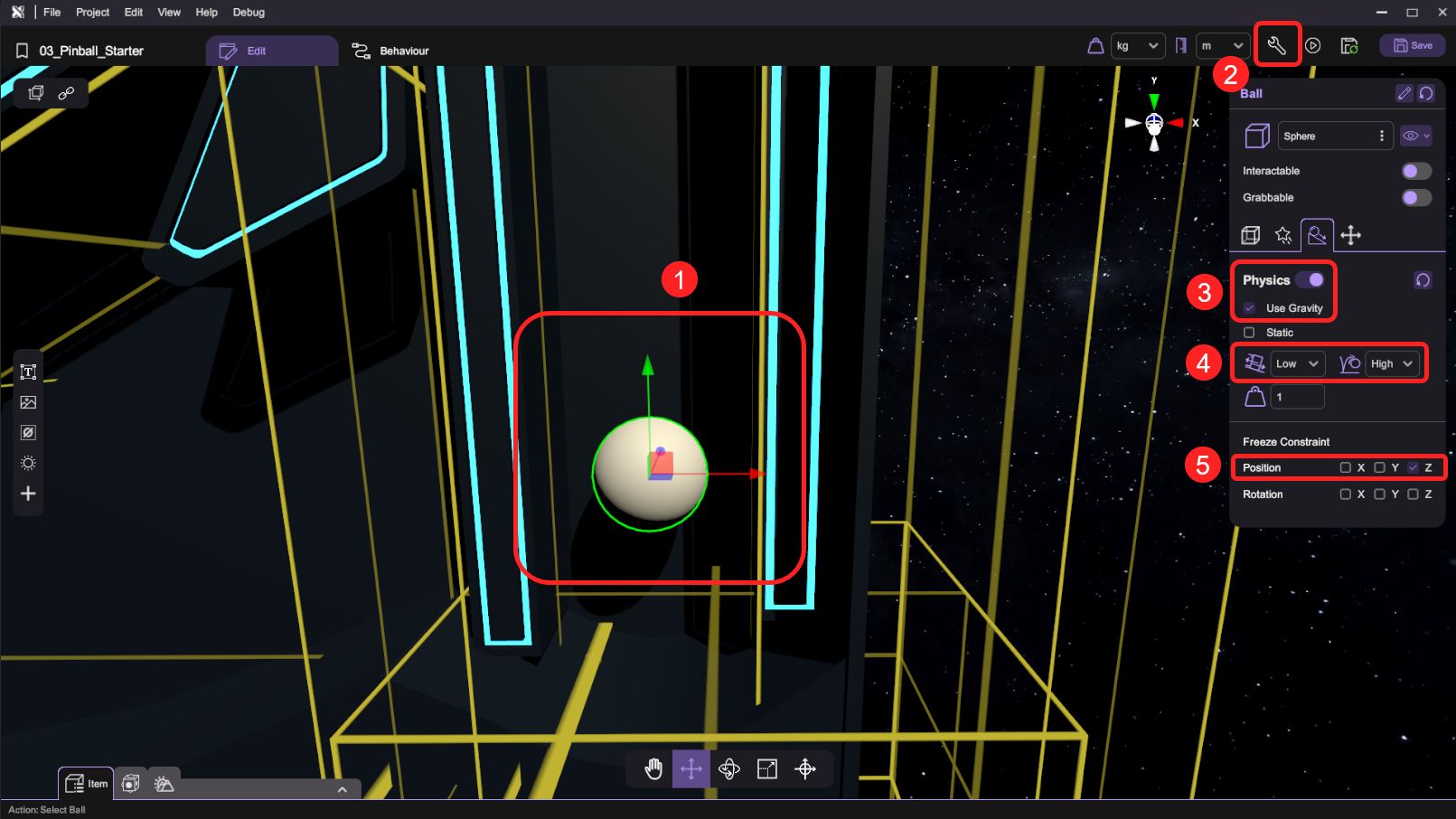 - First, we select the ball and open the "Inspector". Deselect "Interactable" for it then set its physics setting to "Enable Physics" and "Use Gravity". Finally, freeze the Z position under Constraint.