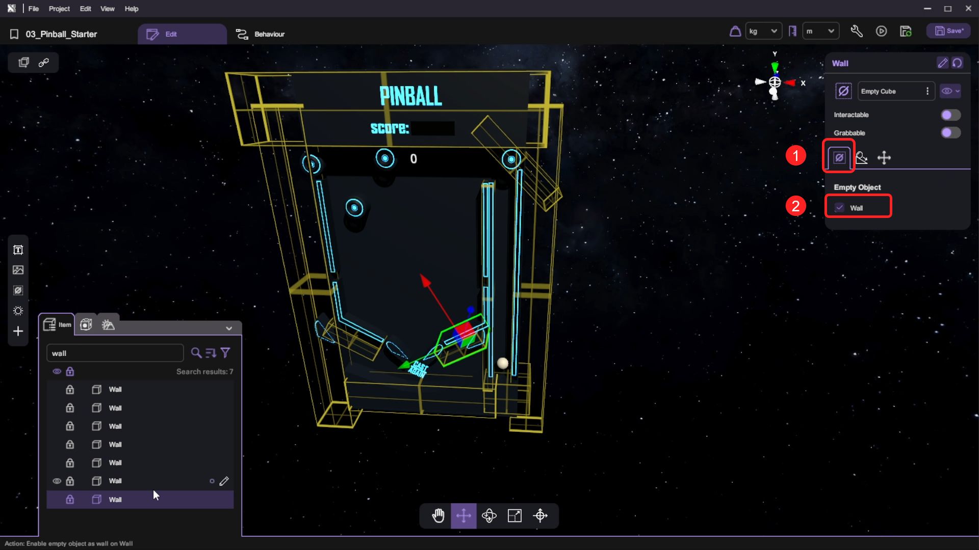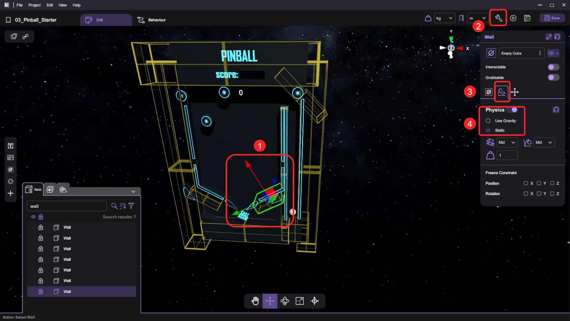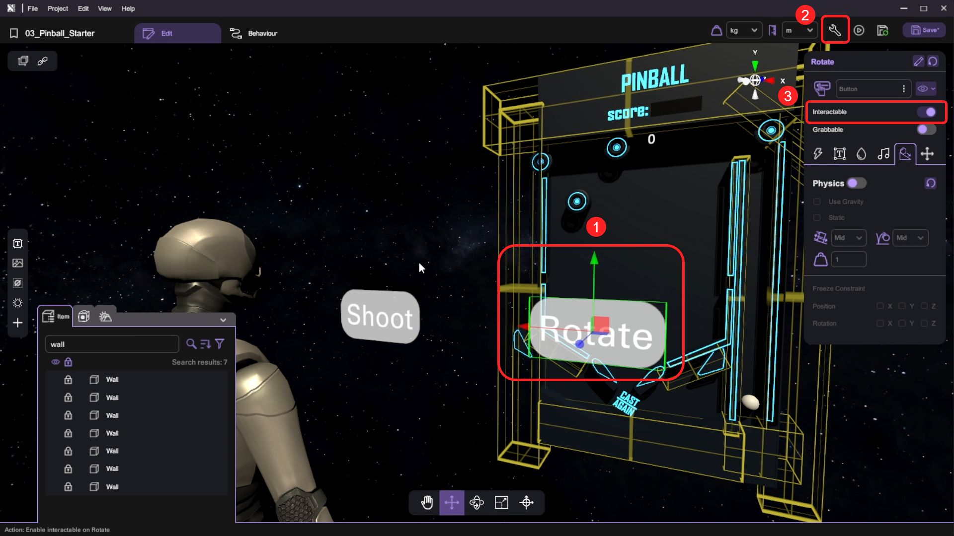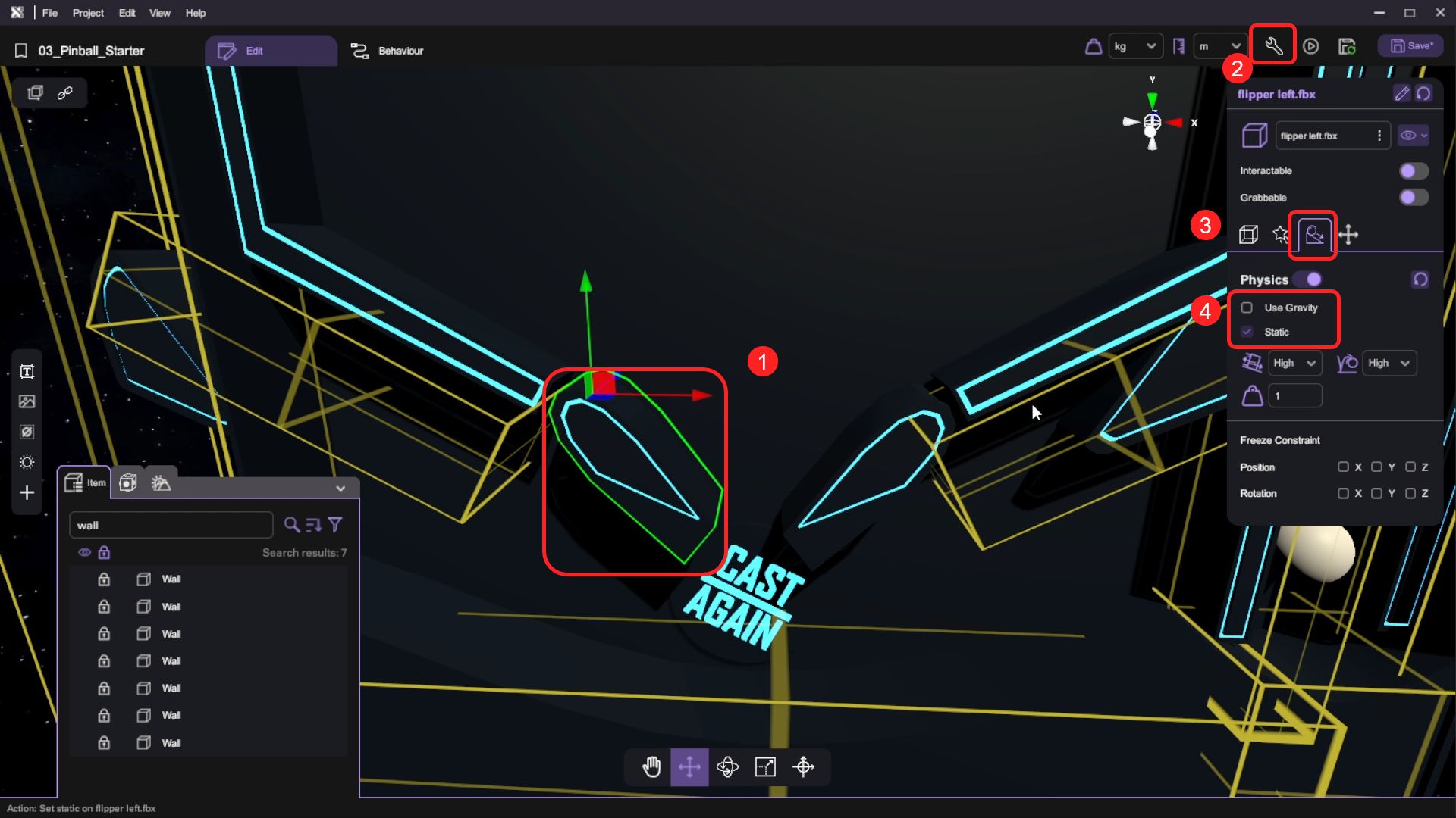 In this section, you will set up the physics and interactivity settings for the key components of the pinball machine. This includes configuring the ball's physics behaviour, setting up static colliders for walls, and making buttons interactive.