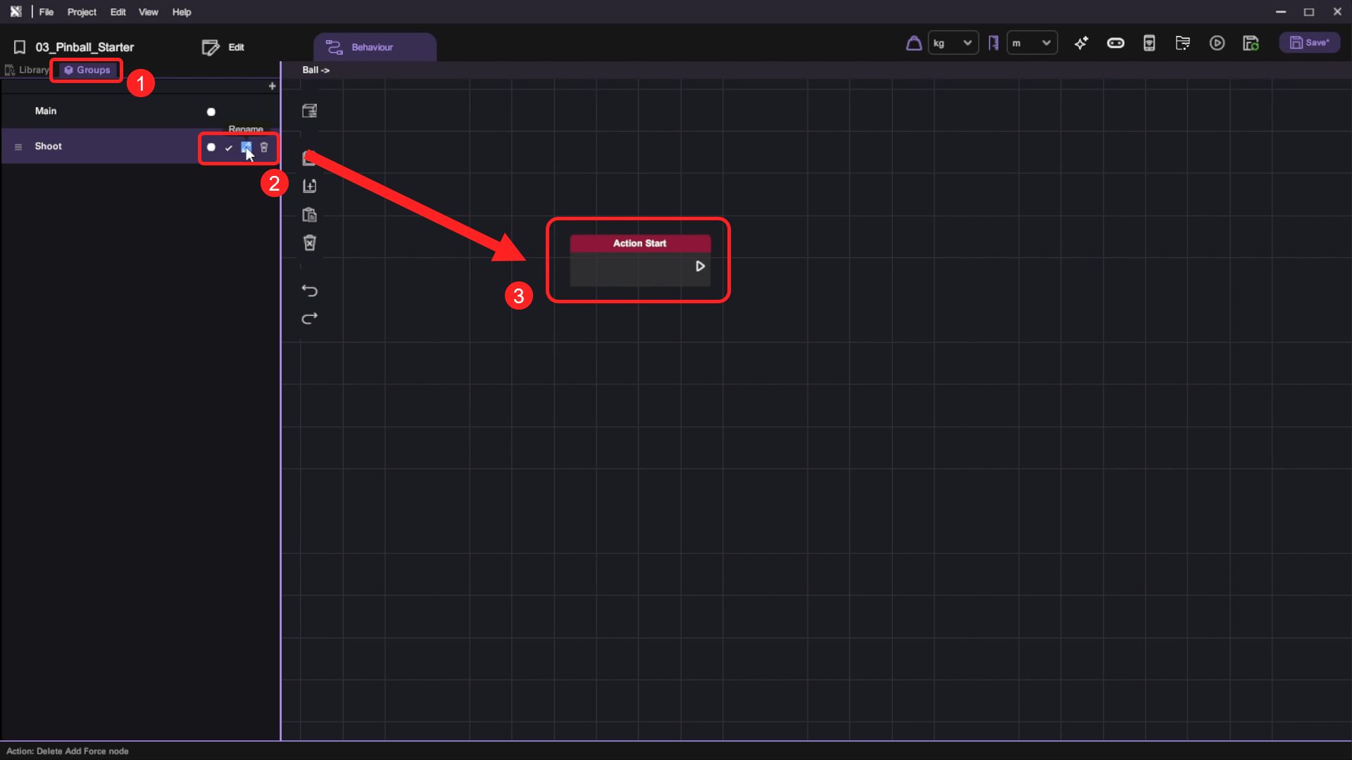 - Open the Ball object's behaviour panel. Under "Group", create an action and rename it to "Shoot". Then toggle the "Action" button to make it an action that can be called by other objects.