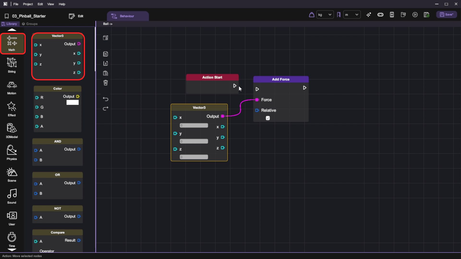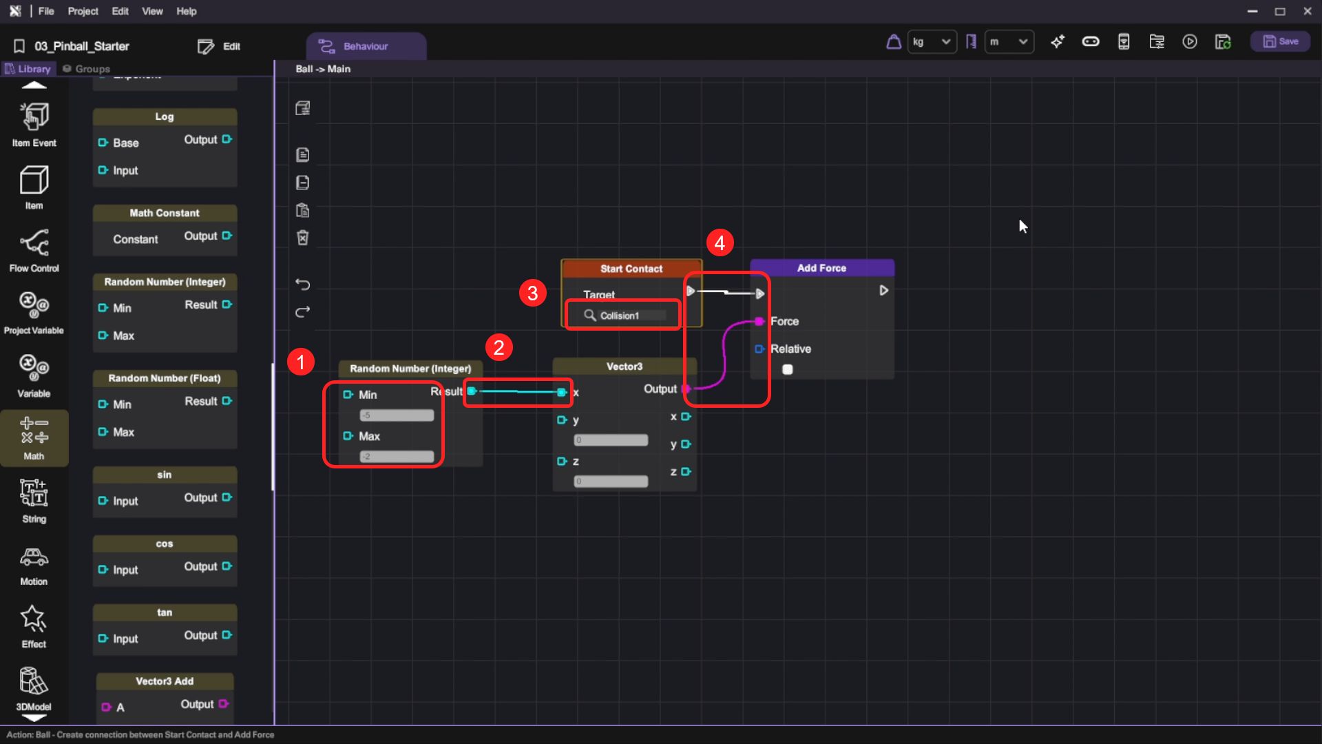 - We want to add force to the ball when it makes contact with "Collision1". We will use the following behaviour:
