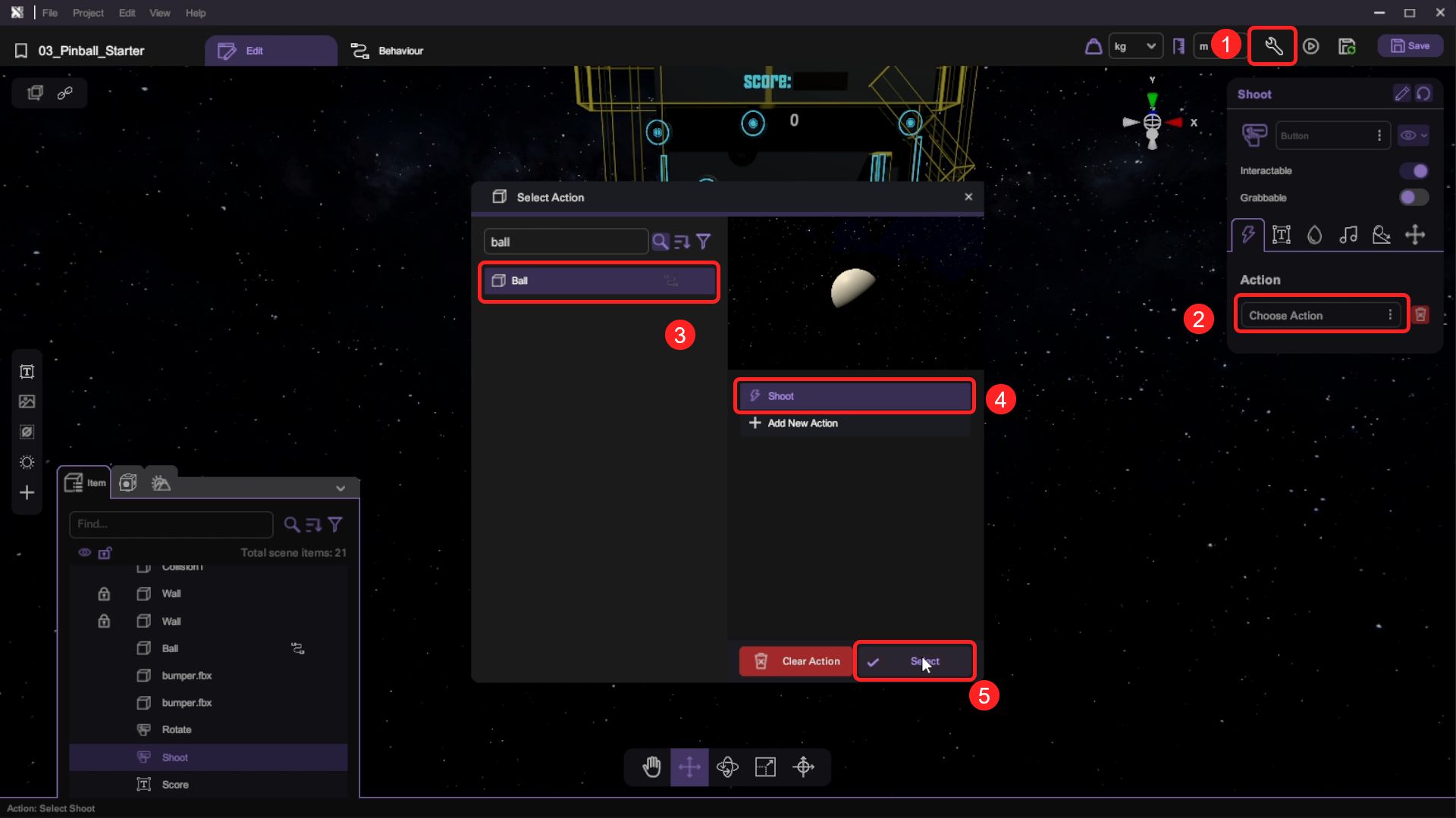 - Go back to the scene and select the "Shoot" button. Open the "Inspector" and select the "Action" option. On the "Select Instance Panel", select the Ball object and choose the "Shoot" action we have just created. Click the "Select" button.