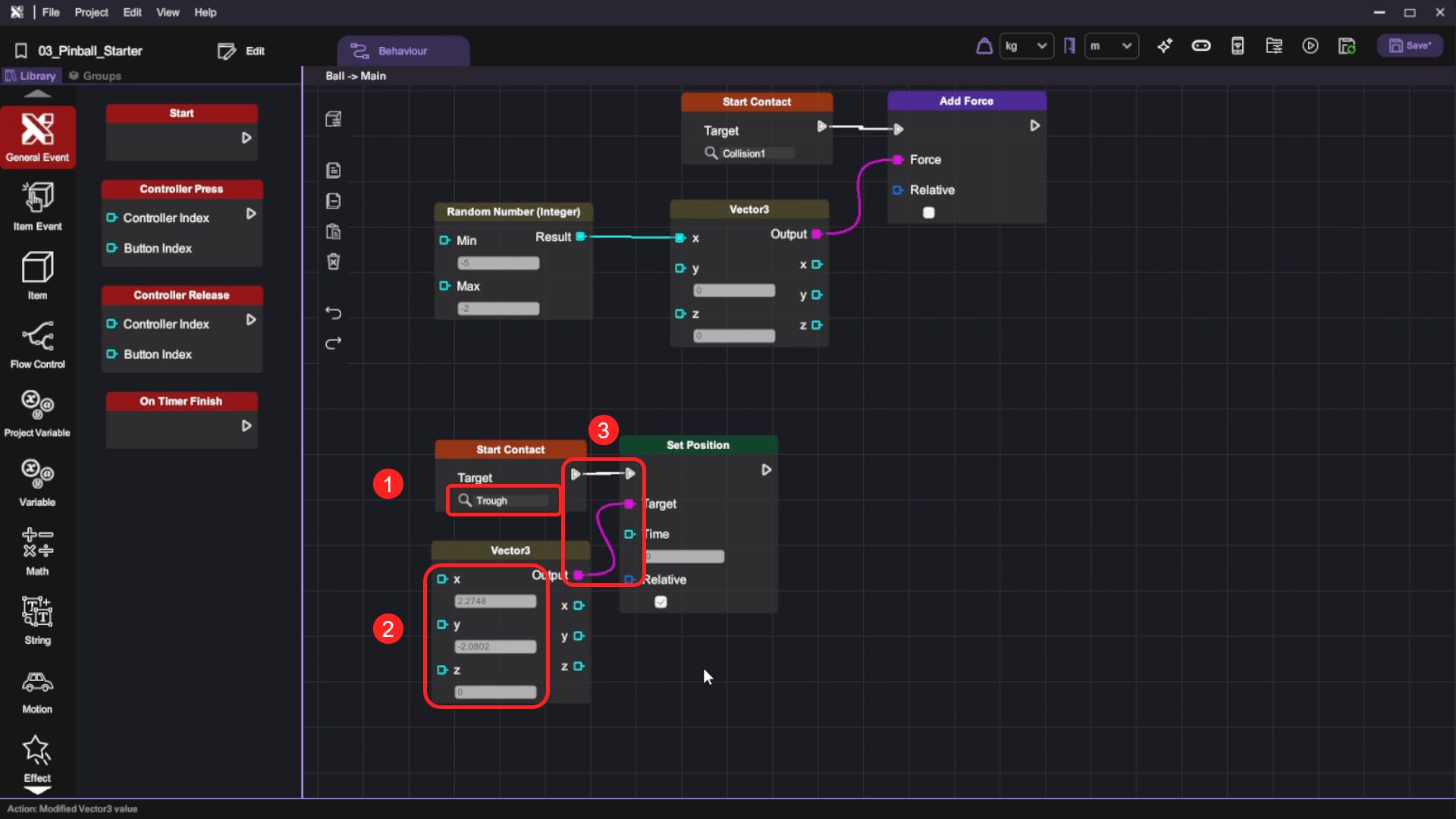 This behaviour flow will reset the position of the Ball when it contacts the Trough.