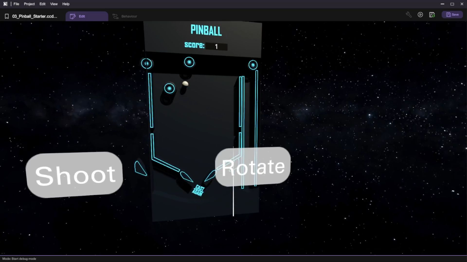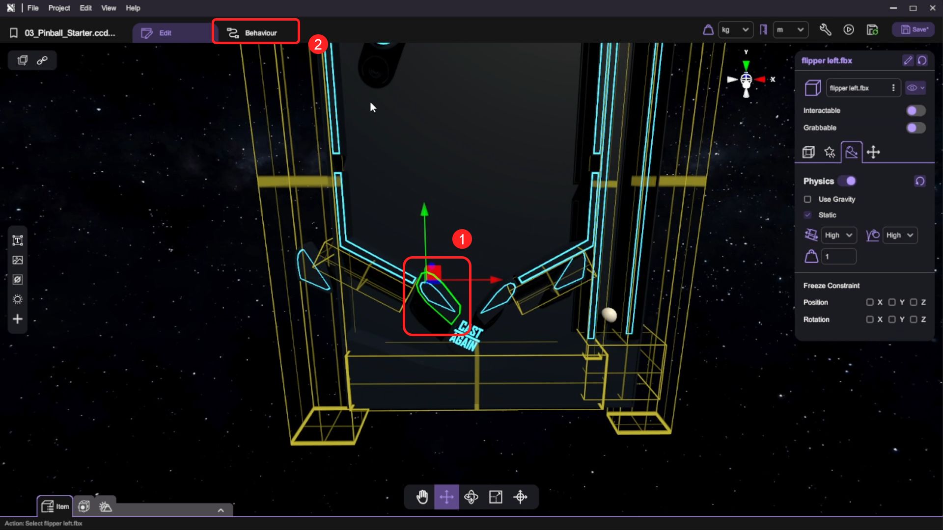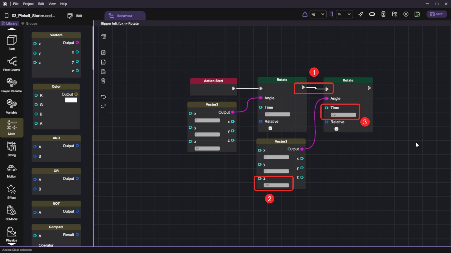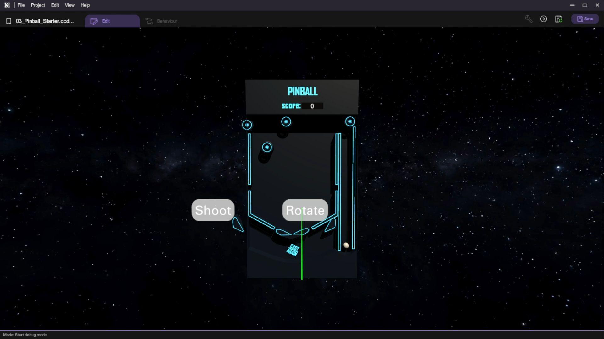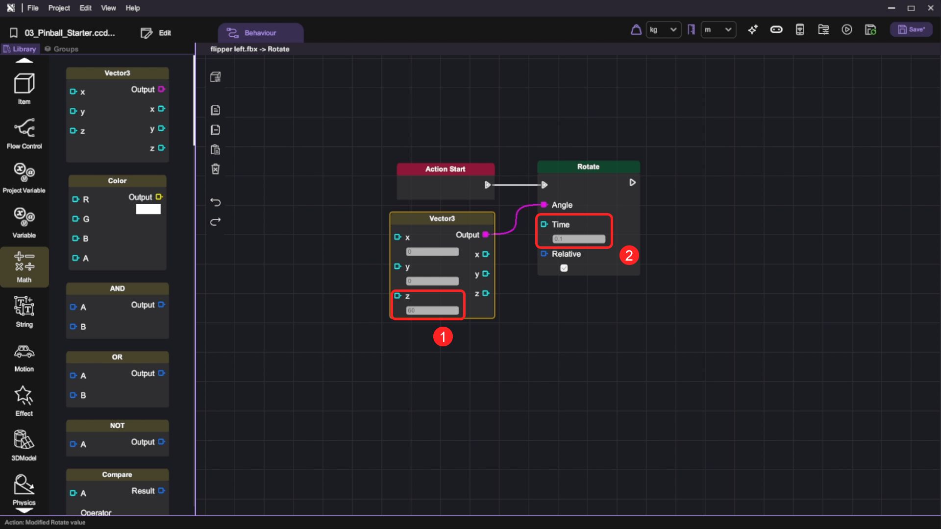 - Press the "Play" button and test the flippers by clicking the "Rotate" button. The left flipper will rotate and return to its original state, but its rotation may look off if you click the button too quickly or too often. Now return to behaviour editing to fix this issue.