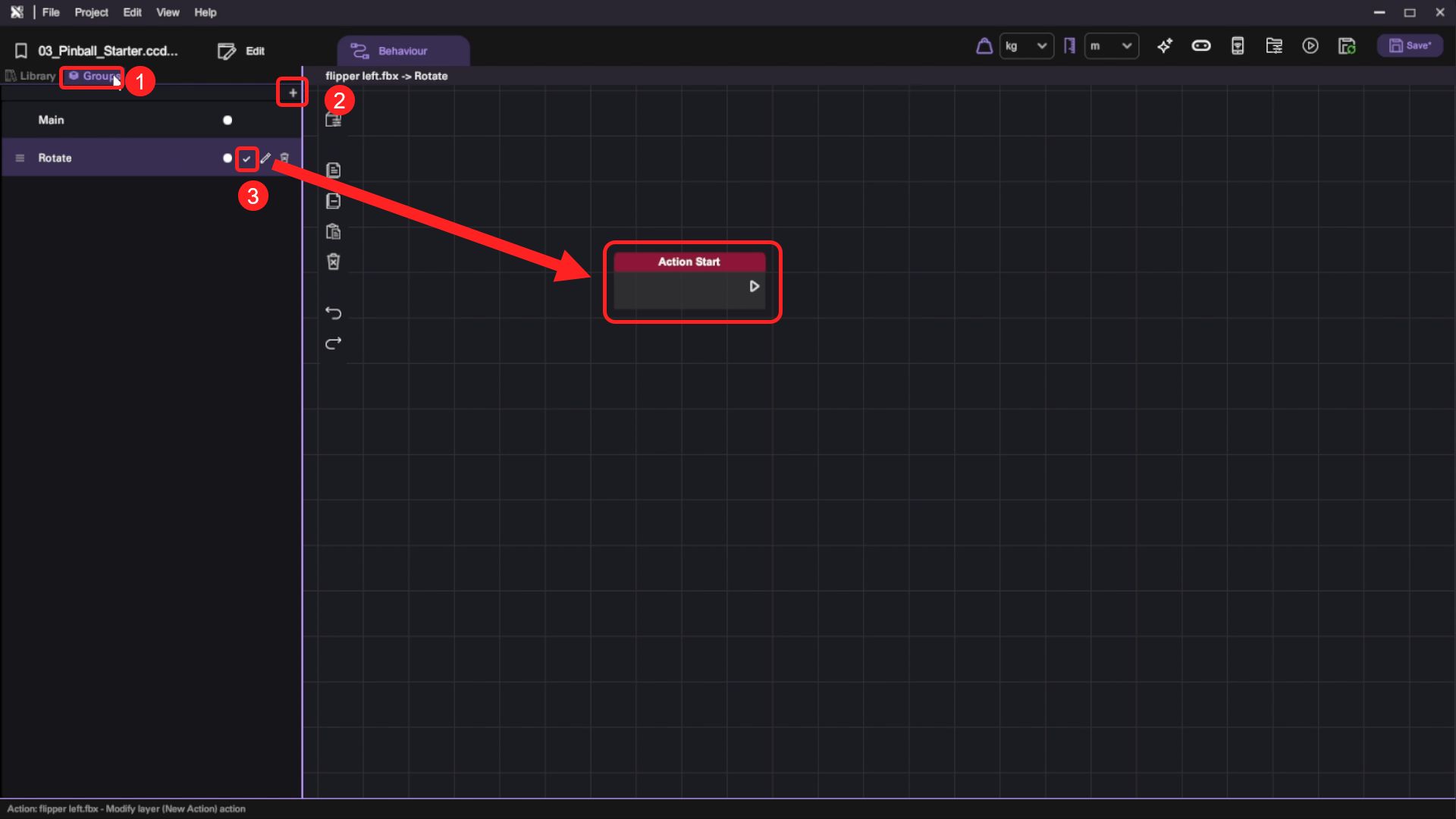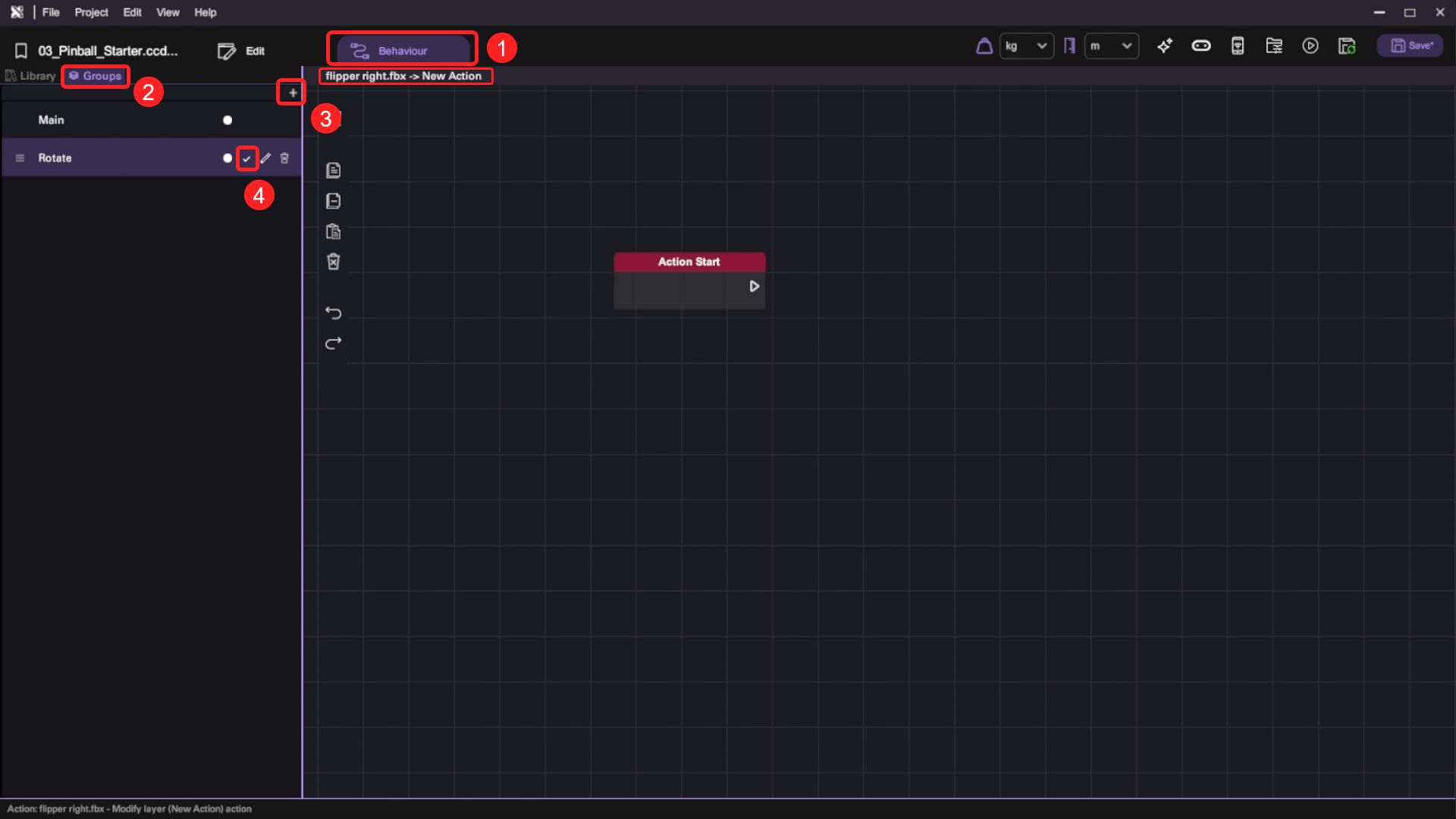 - Under "Groups", add a new behaviour group and rename it to "Rotate". Toggle the "Action" button to make it an action that can be called by other objects. An "Action Start" event trigger block will appear on the canvas.