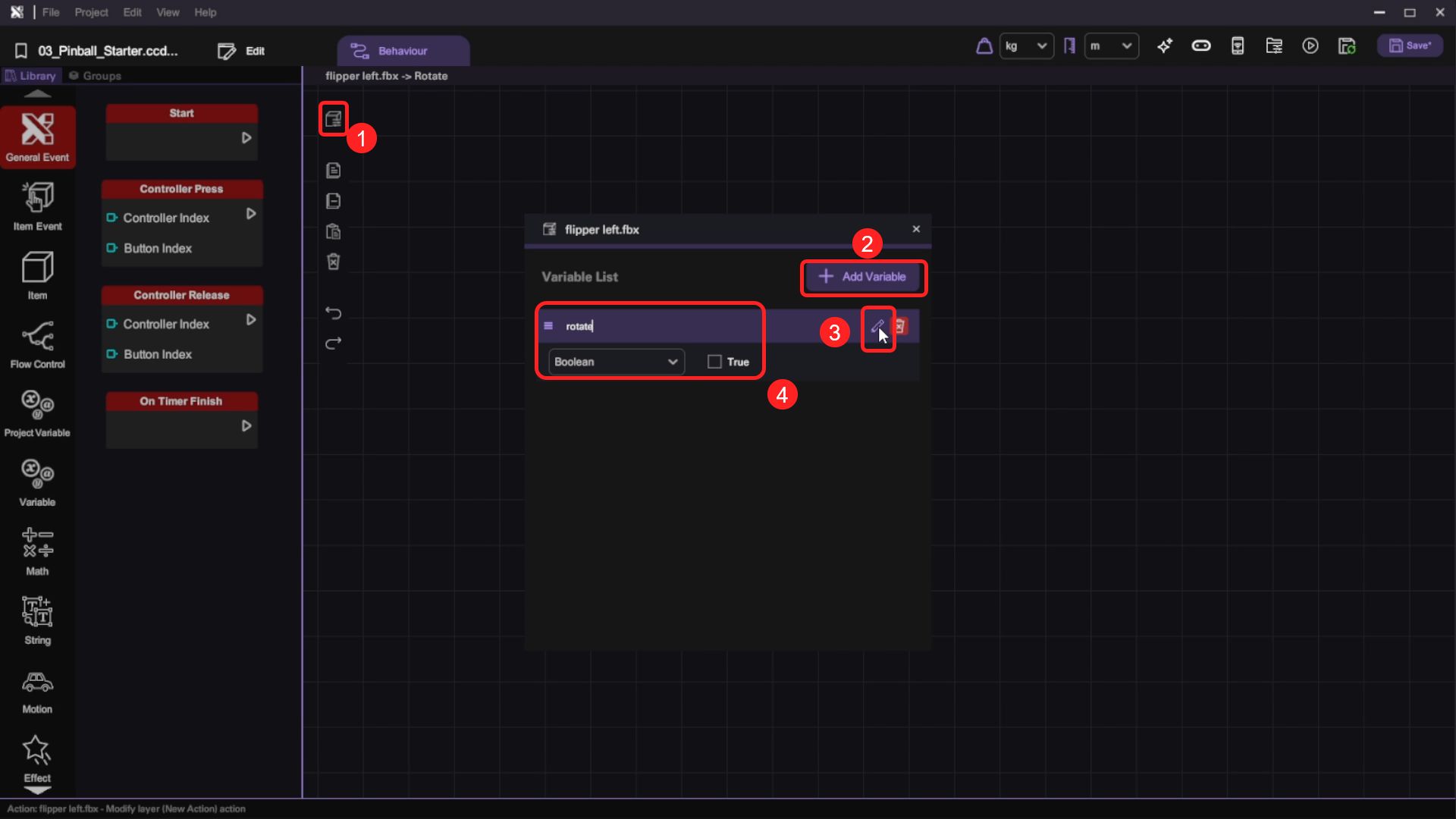 On the right flipper's behaviour panel, open the "Show Item Variables" and add a new variable named "rotate", set the variable type to "Boolean" and set its default value to False.