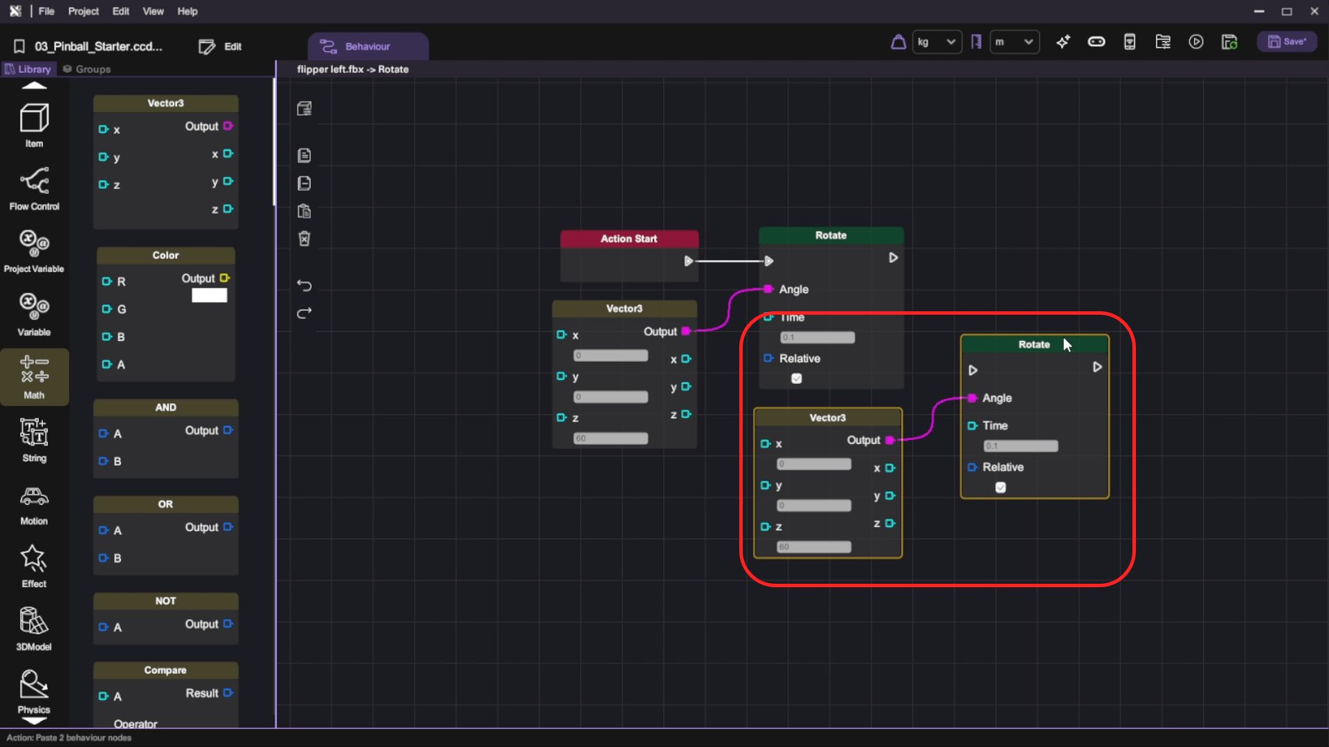 Go back to the left flipper and select the whole behaviour flow, copy them and paste them to the right flipper object's "Rotate" action.