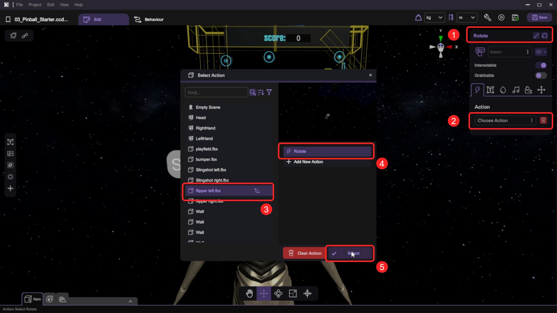 Select the "Rotate" button and click the selector next to the Rotate button's "Action" in the "Inspector" and select the Flipper Left object's "Rotate" action to assign the action to the Rotate button.