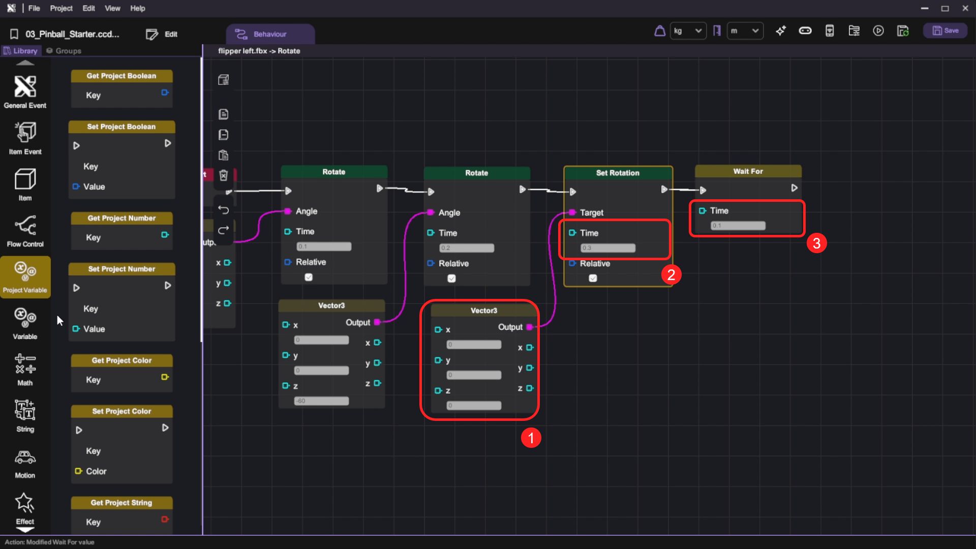 - Return to the "flipper left" object's "Rotate" action. First, add a "Set Rotation" block after the last "Rotate" block and set Time to 0, then add a "Vector3" to set its Target. This will instantly set the flipper back to its original rotation. Then add a "Wait For" block after the "Set Rotation" block, and set the Time to 0.1. When this action is called, the rotation of the left flipper will reset to 0 after it rotates back and wait for 0.1s to cool down.