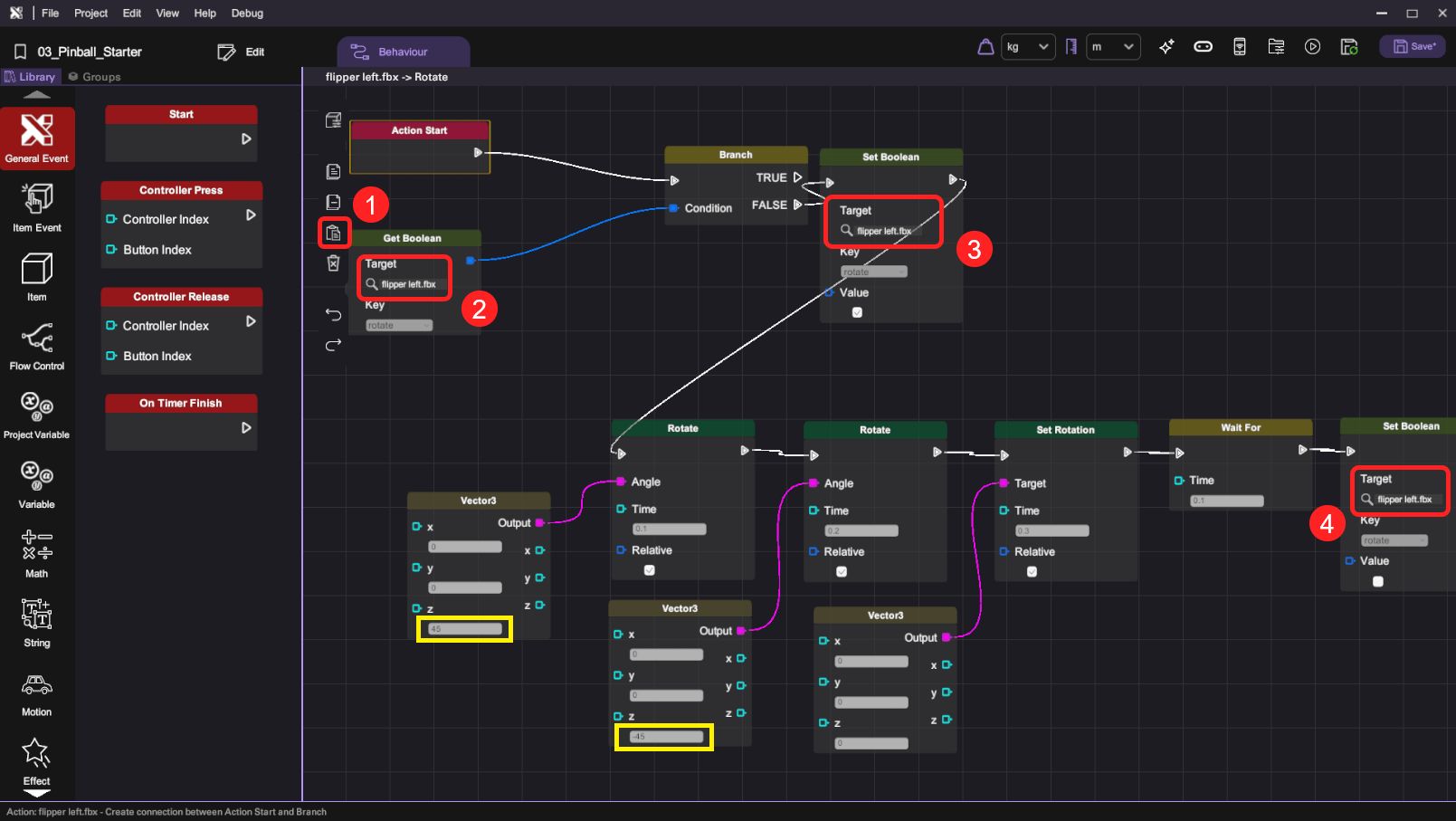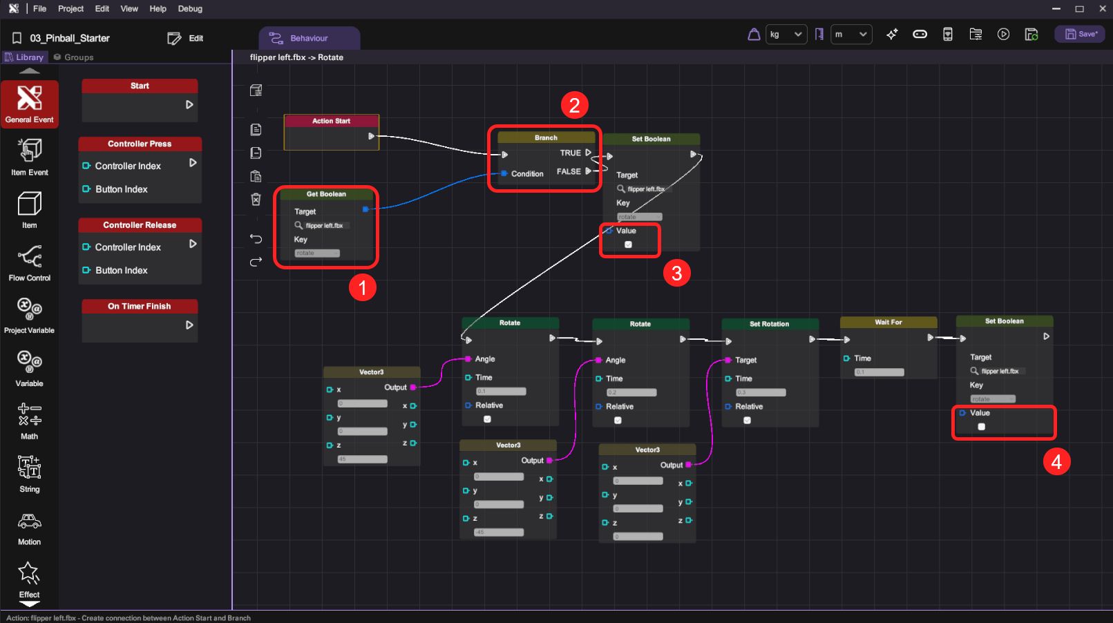 - Step 2: Select "flipper left.fbx" as the "Target" and "rotate" as the "Key" in "Get Boolean" block.