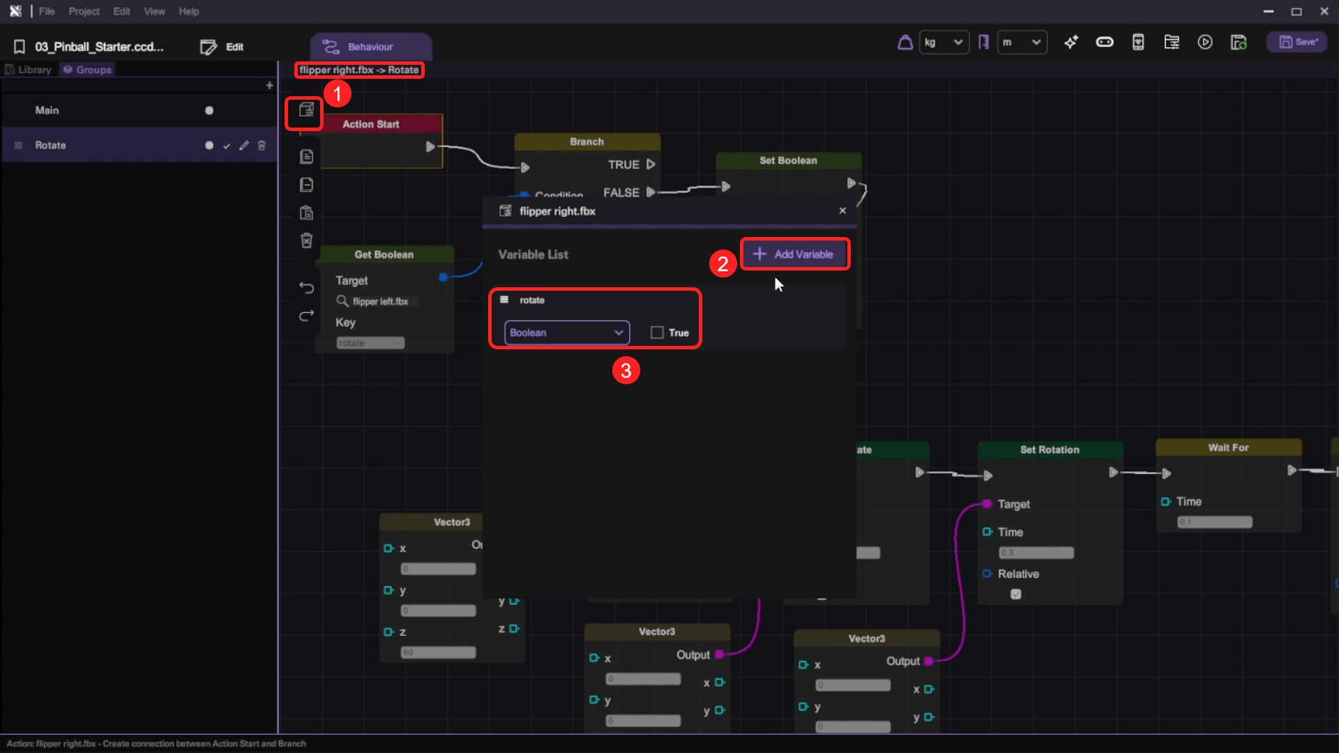 - Step 1: Select "flipper left.fbx" as the "Target" and "rotate" as the "Key" in the "Get Boolean" block. This means get the boolean variable "rotate" from the object.