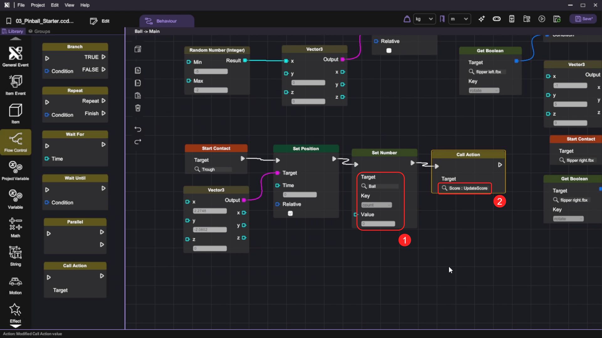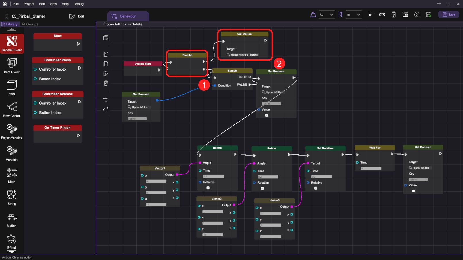 - Open the Flipper Left object's behaviour panel. Break the connection between the "Action Start" and "Branch" blocks and add a "Parallel" block between them. Connect one of the "Parallel" block's out flow nodes with the "Branch" block and add a new "Call Action" block behind the other node. Finally, set the "Target Action" of the "Call Action" block to "flipper right.fbx : Rotate". When this action is called, both sides of the flippers will rotate simultaneously.