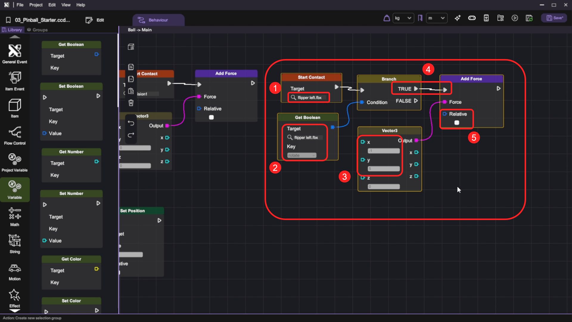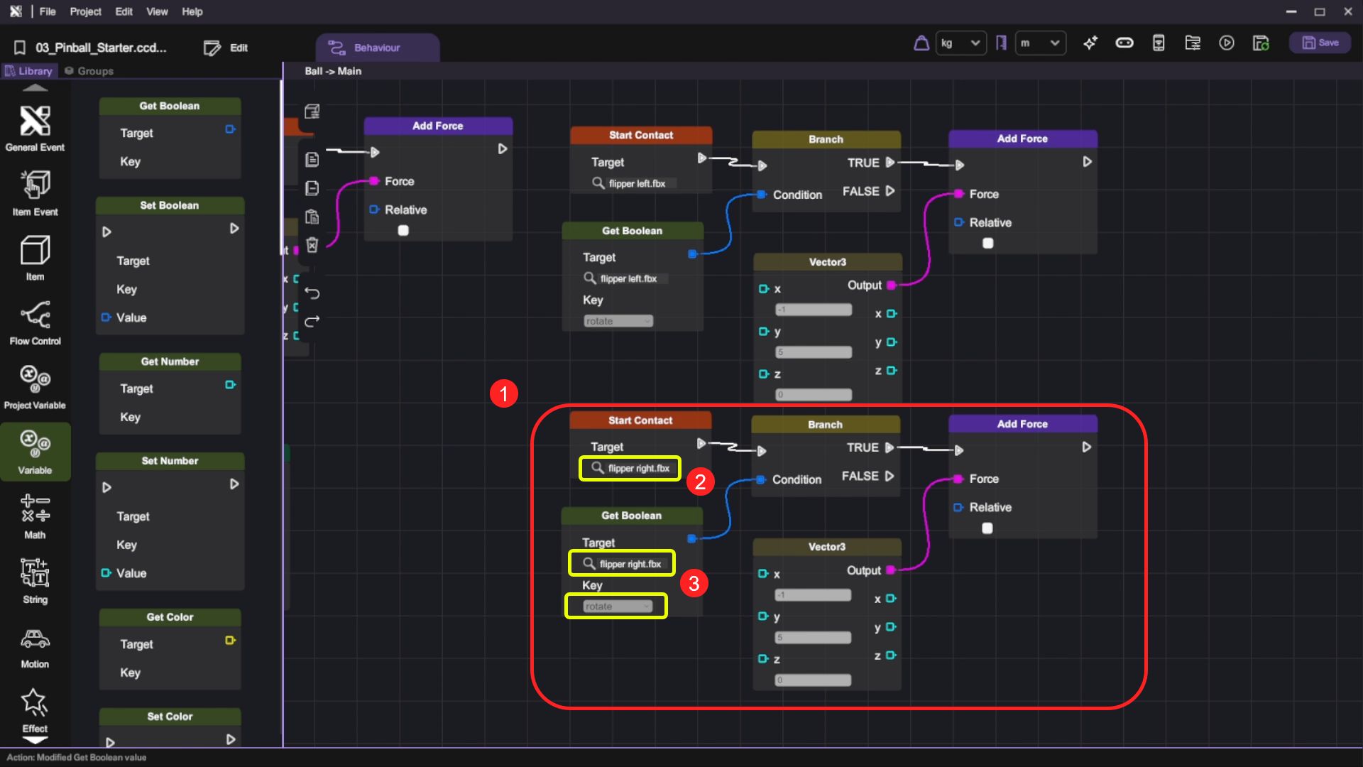 - Repeat the same procedure for the right flipper. Remember to change the target in both the "Start Contact" block and "Get Boolean" block.