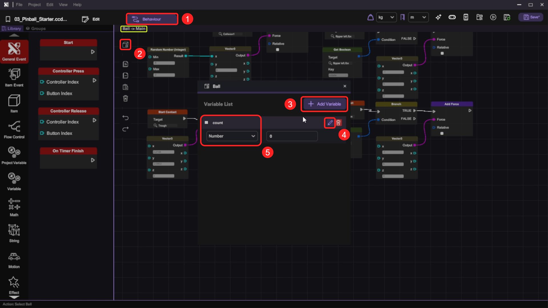- Open the Ball object's behaviour panel and add a new variable named "Count", set the variable type to "Number" and default value to 0.