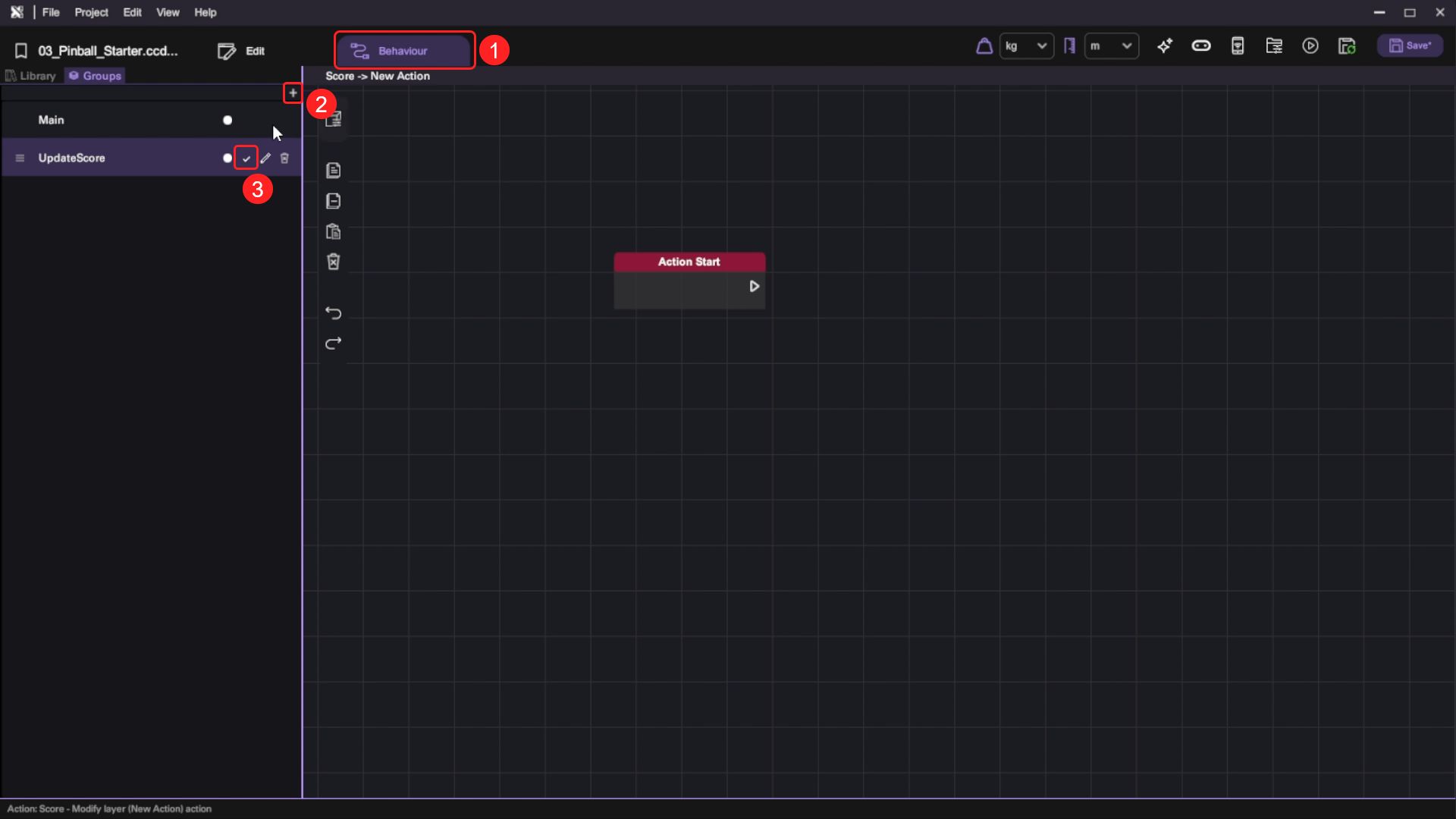 - Select the Score object and open its behaviour panel. Under "Groups", create a new action named "UpdateScore". An "Action Start" event trigger block will appear on the canvas.