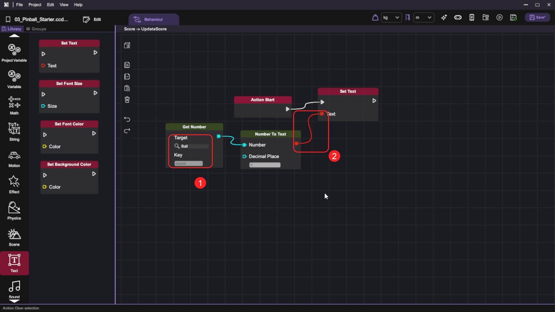 - Switch to the behaviour Library and append a "Set Text" block to the "Action Start" block. Use a "Get Number" block to retrieve the "ball" object's "Count" variable value, then use a "Number To Text" block to convert the number to Text format for display by the "Set Text" block. When this action is called, the score will be updated.