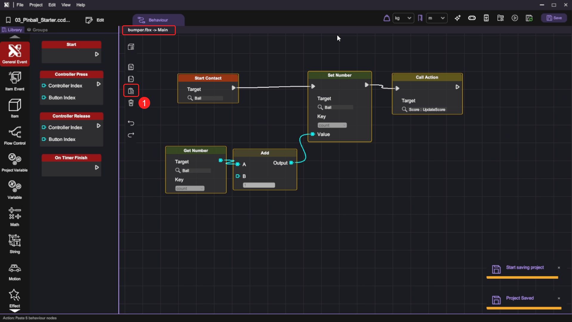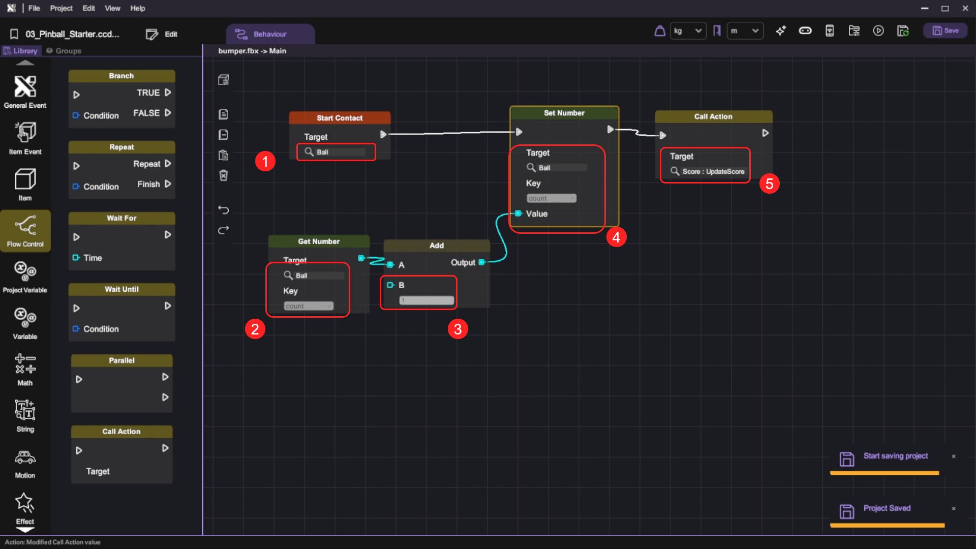 - We want to give some score to the player if the ball hits the bumpers and slingshots in the playfield. Using the left bumper as an example, open its behaviour panel and add a "Start Contact" block onto the canvas, set the Target to "Ball". Then add a "Set Number" block to update the score. To do so, use a "Get Number" block to retrieve the current score on the "Ball" object's "Count" variable then use an "Add" block to increment the score by 1. Finally, add a "Call Action" block and set its "Target Action" to the "Score" object's "UpdateScore" action, so the updated score will be displayed.